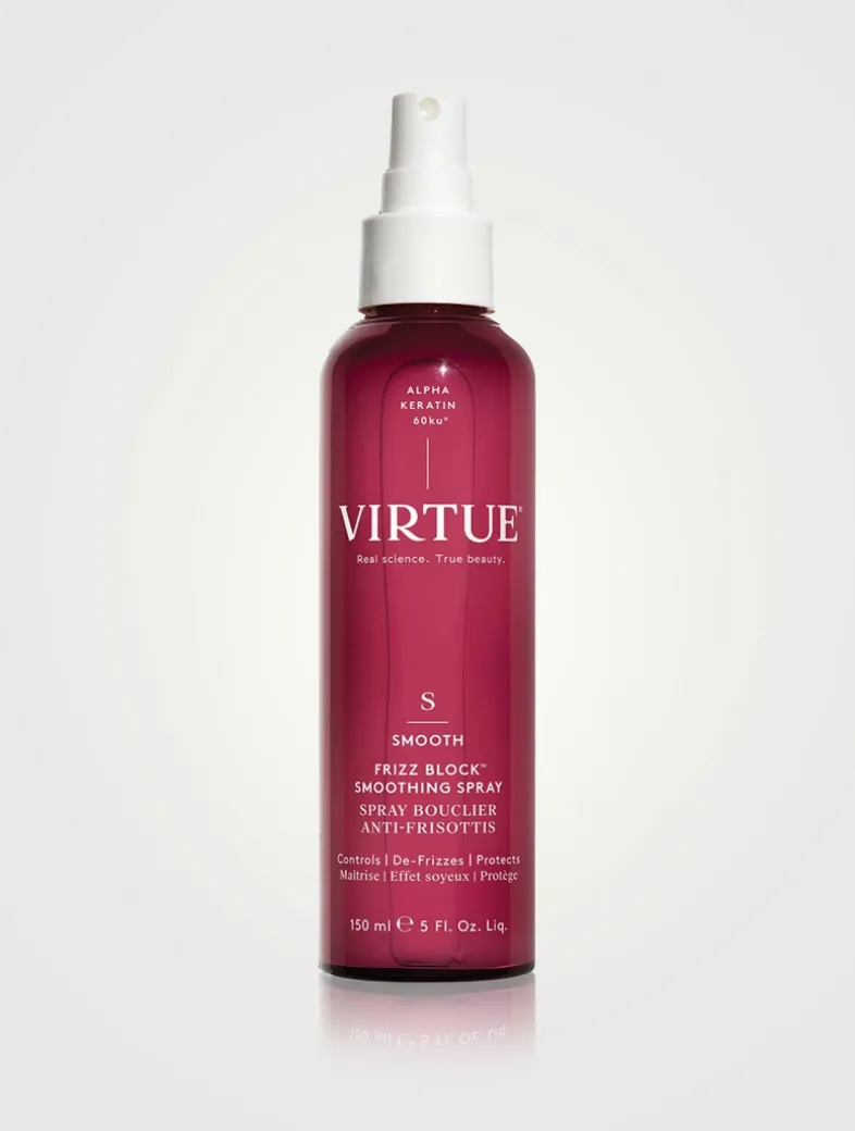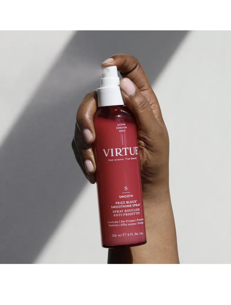 A lightweight, milky microemulsion mist. Controls, De-Frizzes, Protects. A weightless, humidity-halting spray with ingredients that help protect hair from UV damage and stop frizz in its tracks for 72 hours of heat-safe, silky-smooth strands. Frizz Block Smoothing Spray creates an impenetrable veil of humidity-blocking, frizz-stopping, moisture-locking mist that protects strands for 72 hours. Created for harsh humid conditions, this alcohol-free, heat-activated spray is the prescription-strength equivalent of traditional anti-frizz sprays. Virtue’s proprietary Alpha Keratin 60ku® instantly fills and seals cracked cuticles while featherweight polymers and lipids hover above, repelling air-born humidity. This lightweight, milky mist is alcohol free, so it won’t create build-up or dry out hair, and it’s heat protective up to 450 degrees, leaving hair healthy, silky-soft, and free of frizz for days.