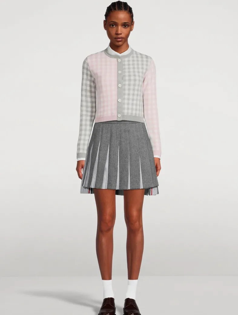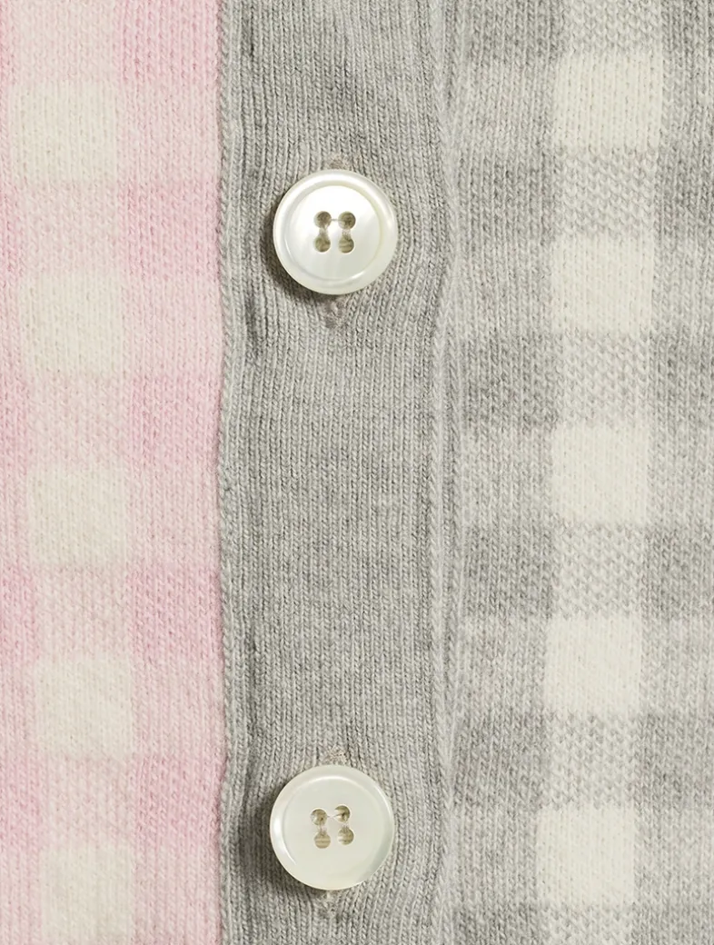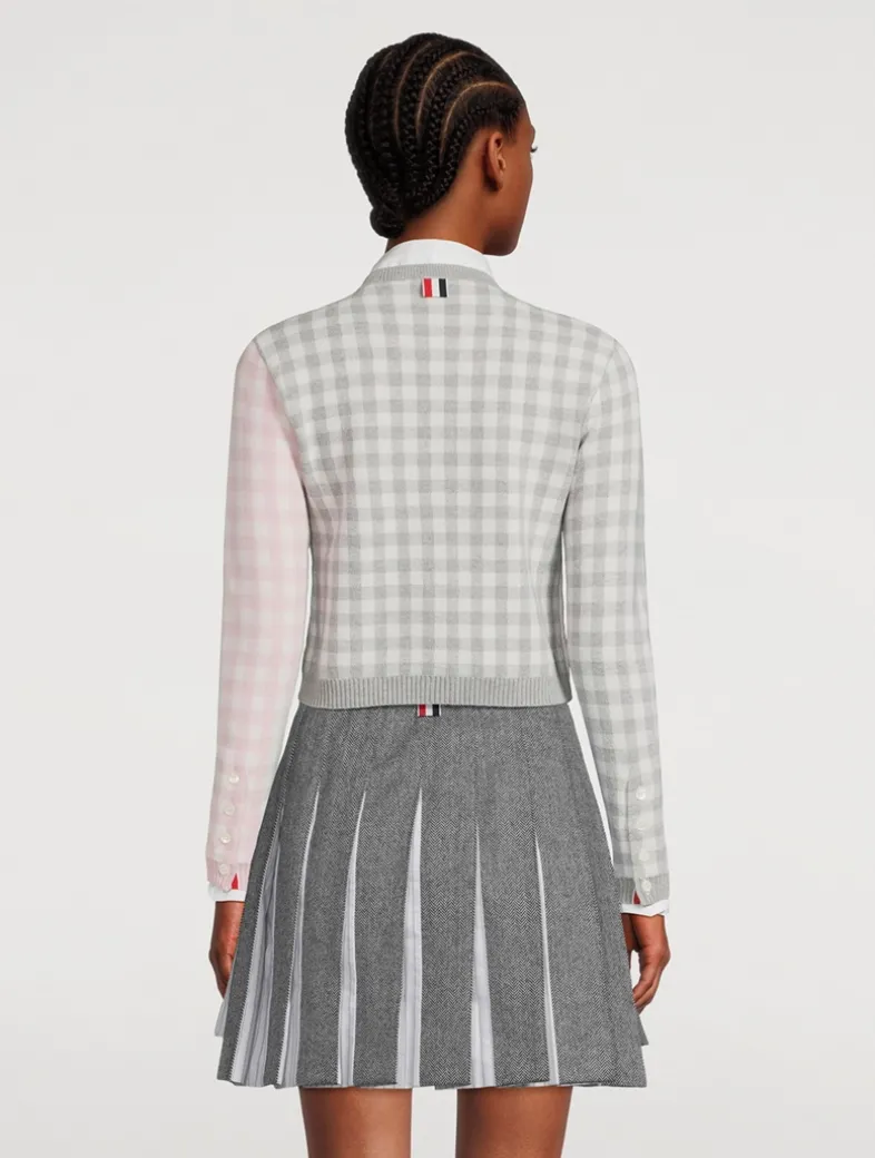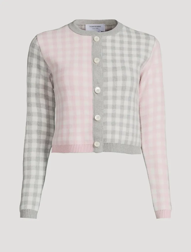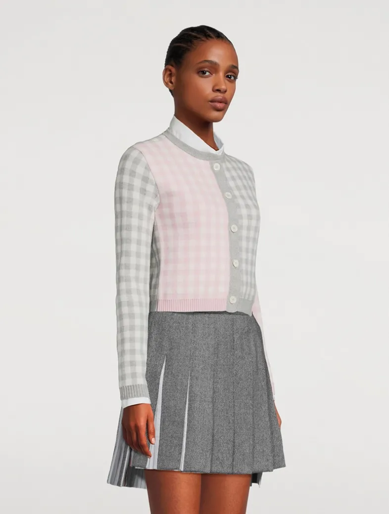 A classic gingham motif in a colourblock design adorns this cardi. Knit from wool with a hint of stretch, it has a crew neckline, buttoned closure, and slim fit. Buttoned cuffs complete the preppy look.