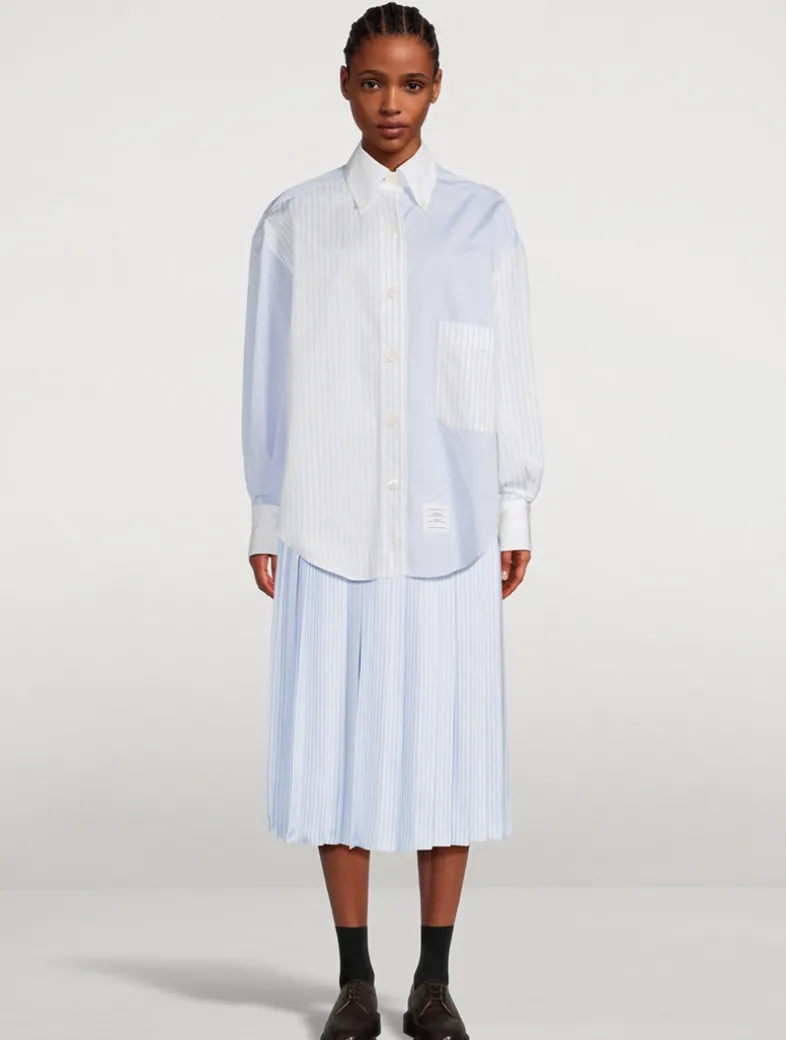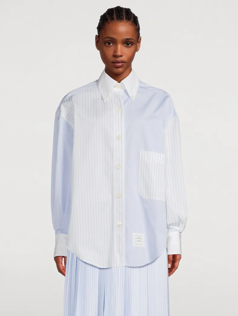 Inspired by preppy American country life, this voluminous poplin shirt features contrasting stripes stitched together in a patchwork form. Underneath the cuff lies the brand’s signature grosgrain trim, adding a touch of understated luxury.