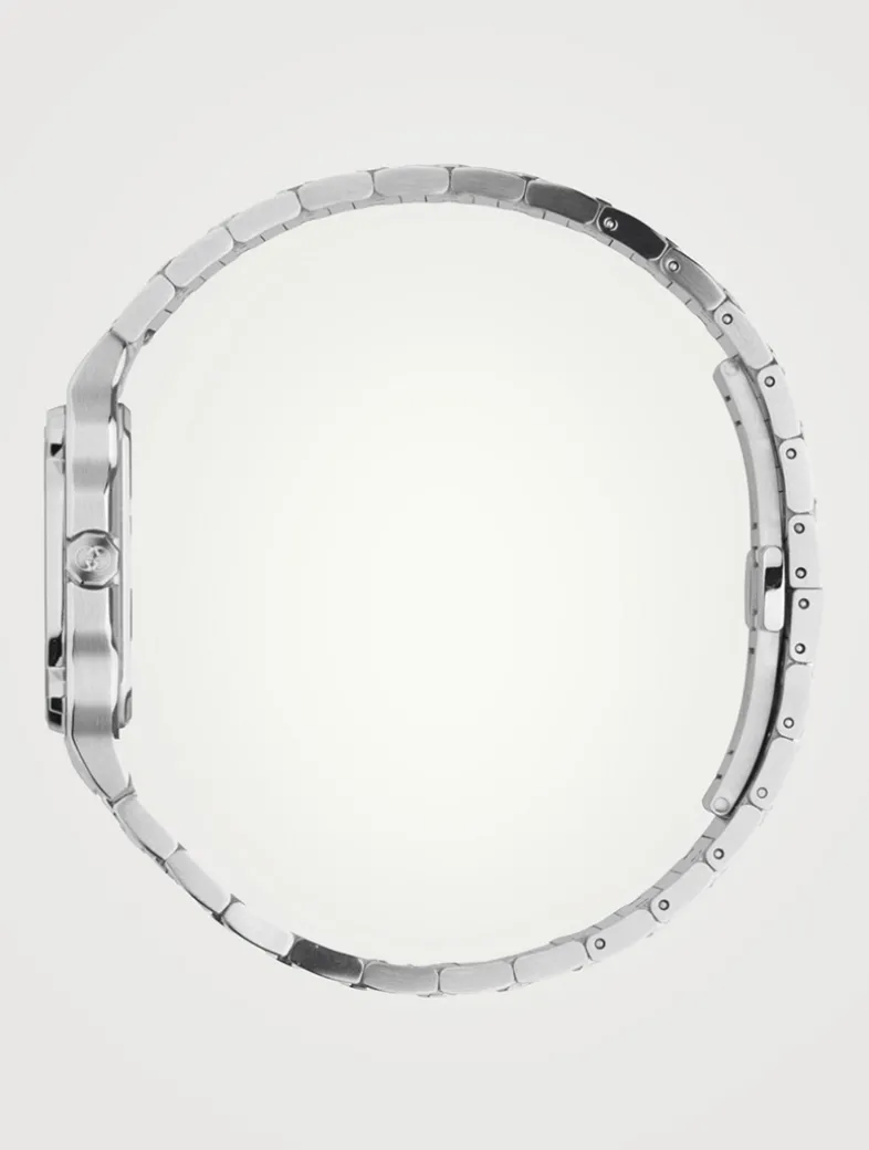 Featuring a sleek flat case shape, this stainless steel bracelet watch is distinguished by a date window at 3 o’clock and bold black dial.