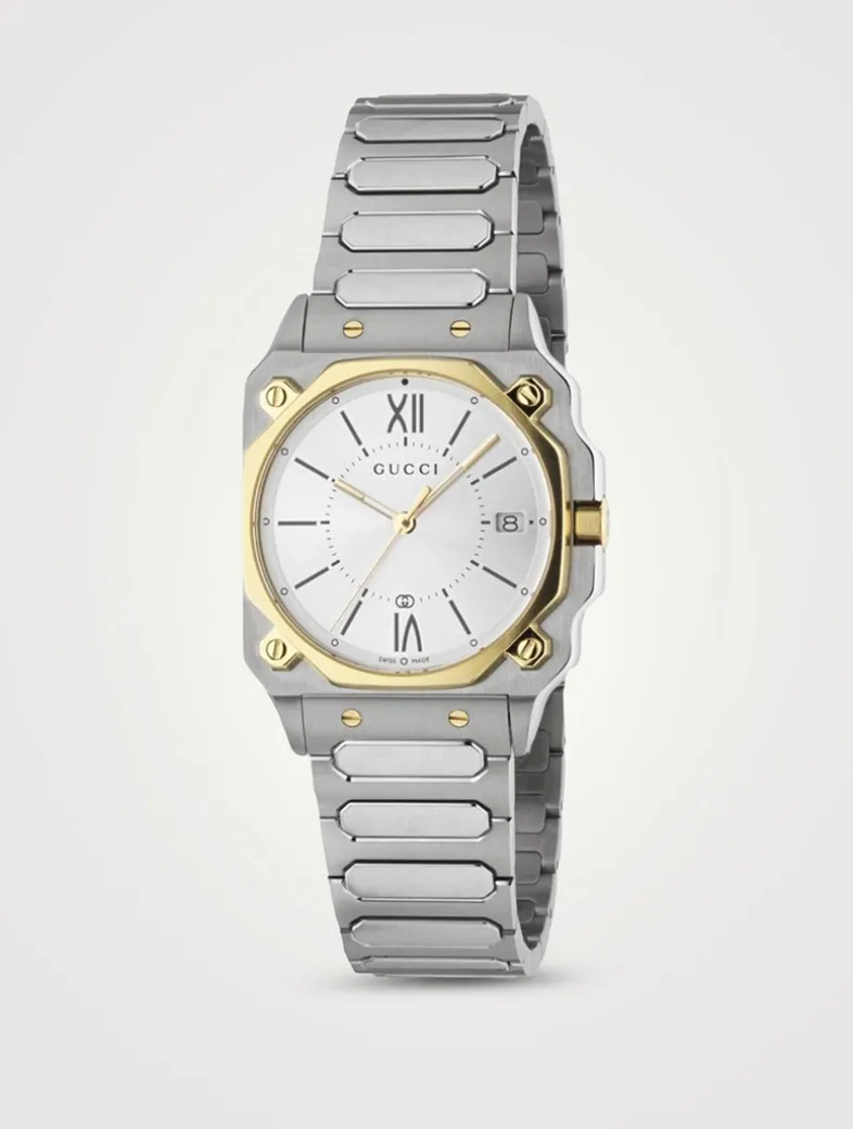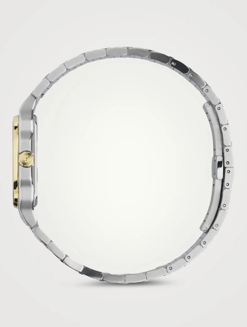 Featuring a sleek flat case shape, this stainless steel bracelet watch is distinguished by a date window at 3 o’clock and 18k gold plated details.