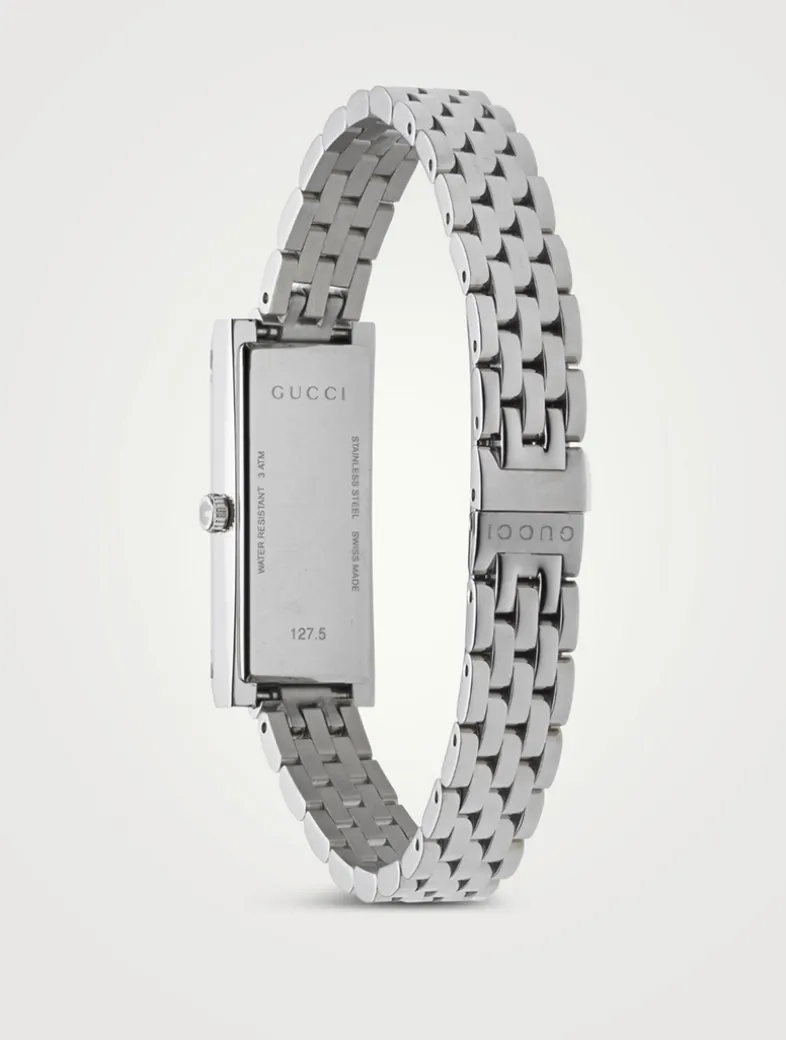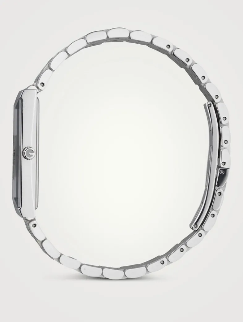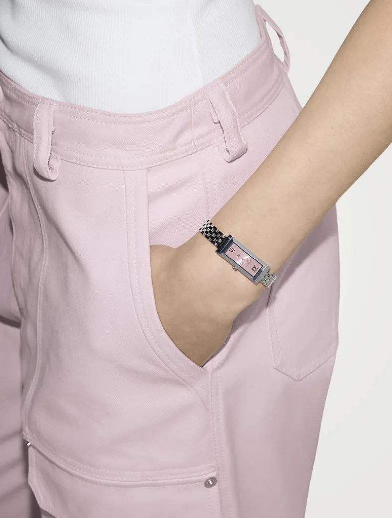 Defined by an elegant rectangular-shaped case, the G-Frame collection blends heritage details with a contemporary aesthetic. Crafted with a stainless steel case and strap, the accessory is further enriched with a pink dial with diamonds.