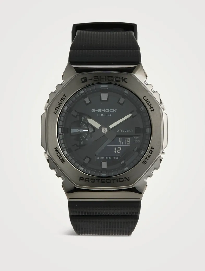 Metal-clad in all black for luxe appeal, this analog-digital G-SHOCK watch says strong, steely, and stylish.
