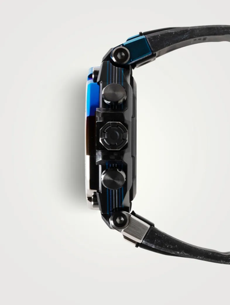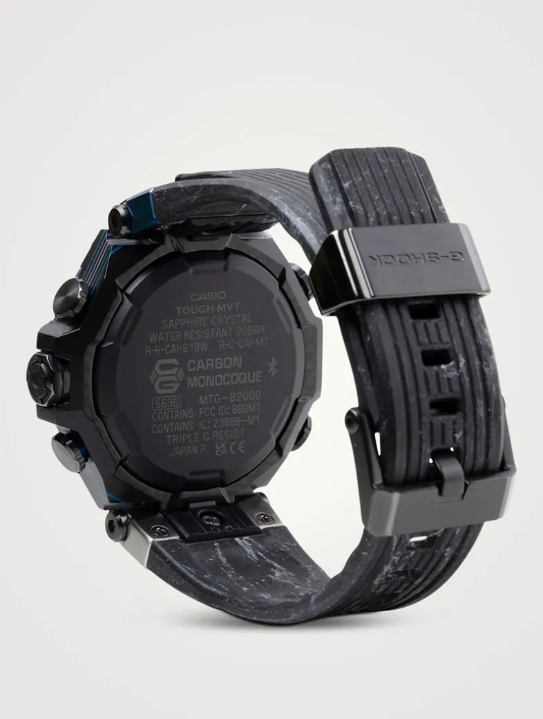 The highly distinctive MTG-B2000YS design takes inspiration from storm chasers. The awesome grandeur of nature is captured with a multi-coloured, multilayer carbon frame and rainbow ion-plating. The frame, constructed of layers of laminated carbon and glass fiber sheets, is treated to a phosphorescent finish. The stainless-steel bezel is ion-plated then finished with beautiful gradations to project the capriciousness of rapidly changing weather conditions. Soft urethane is used for the band, delivering flexibility and durability. With Multiband 6, Tough Solar charging system, and high-brightness LED light, this timepiece keeps you at peak performance, no matter what Mother Nature has to say.