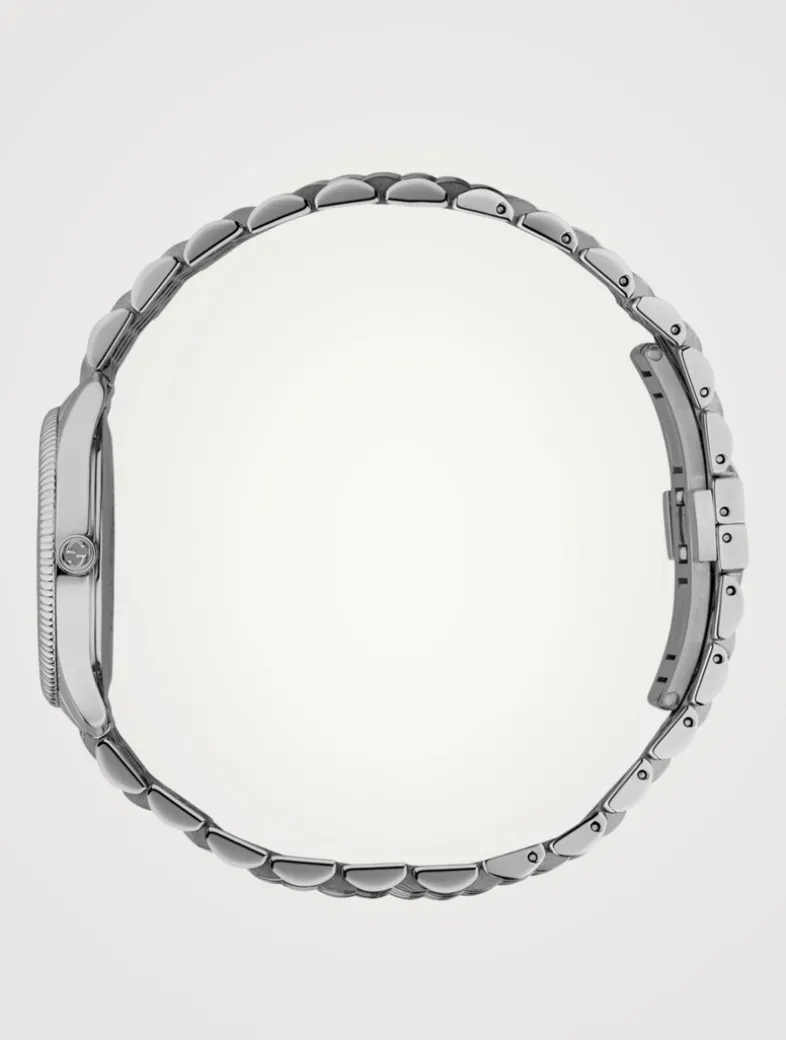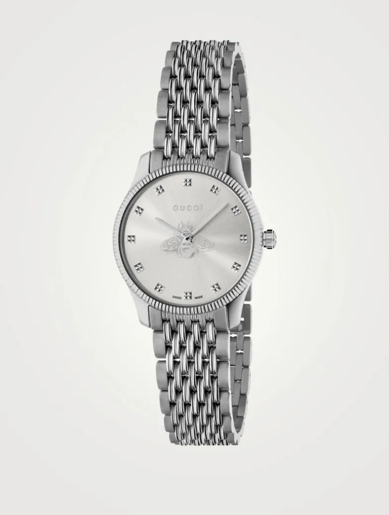 From the G-Timeless collection. Swiss-made with a steel case and nine-link steel bracelet, this classic watch features a silver sunbrushed dial with the bee motif as the seconds hand.