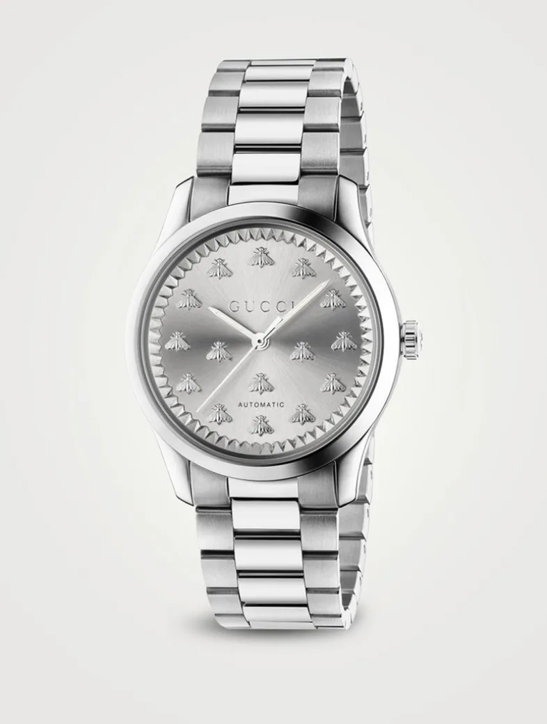 Part of the G-Timeless collection, this automatic watch is designed with a silver sunbrushed dial, enriched with tonal Gucci bee indexes.