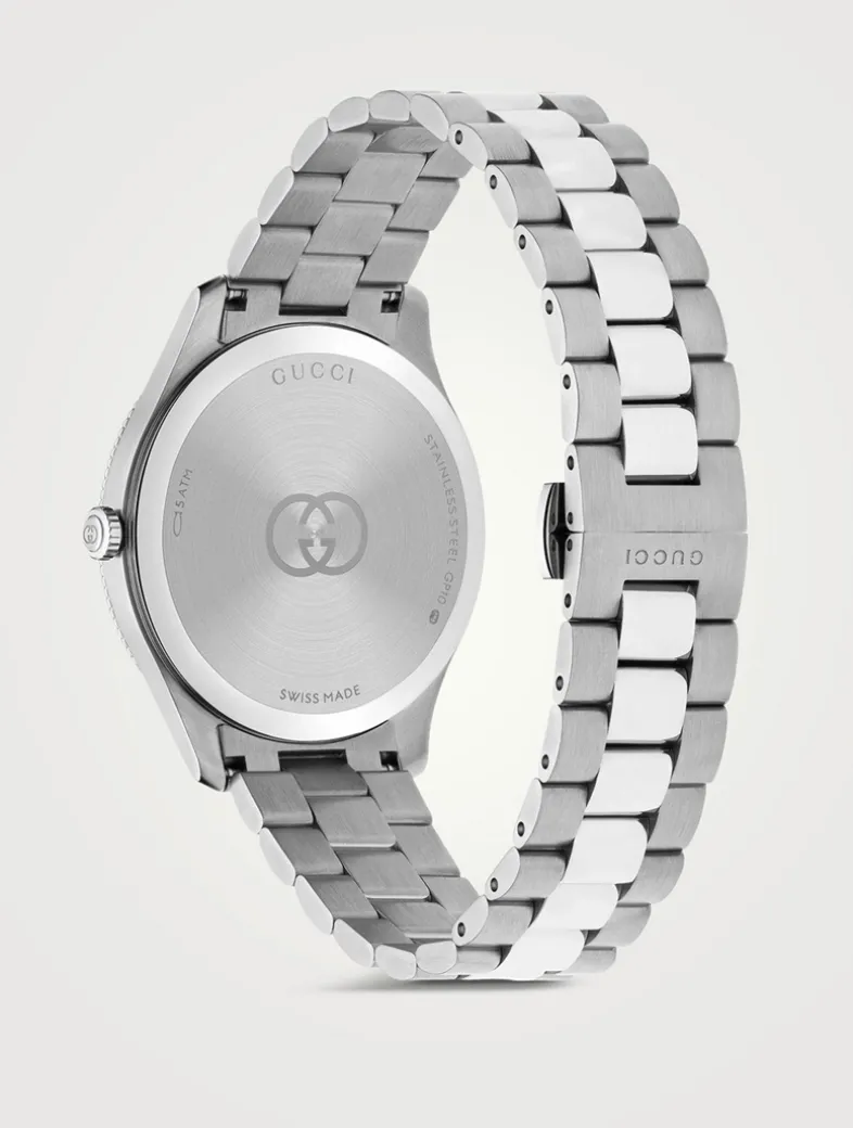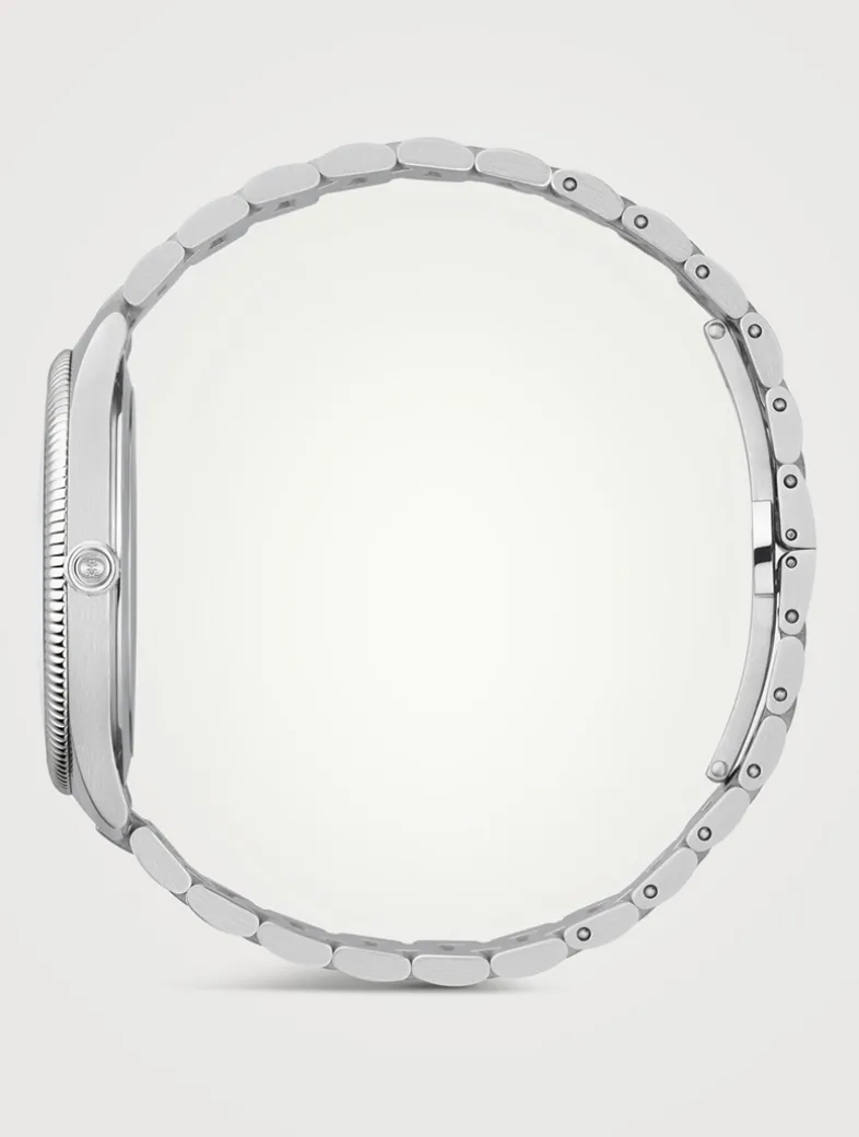 The round shape of this watch spotlights a gold-plated dial with a date window at 3 o’clock and subtle expressions of the Interlocking G and the Gucci lettering. Finished with a steel bracelet, the accessory is enriched with signature motifs of the House.