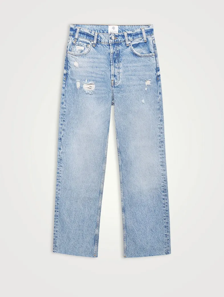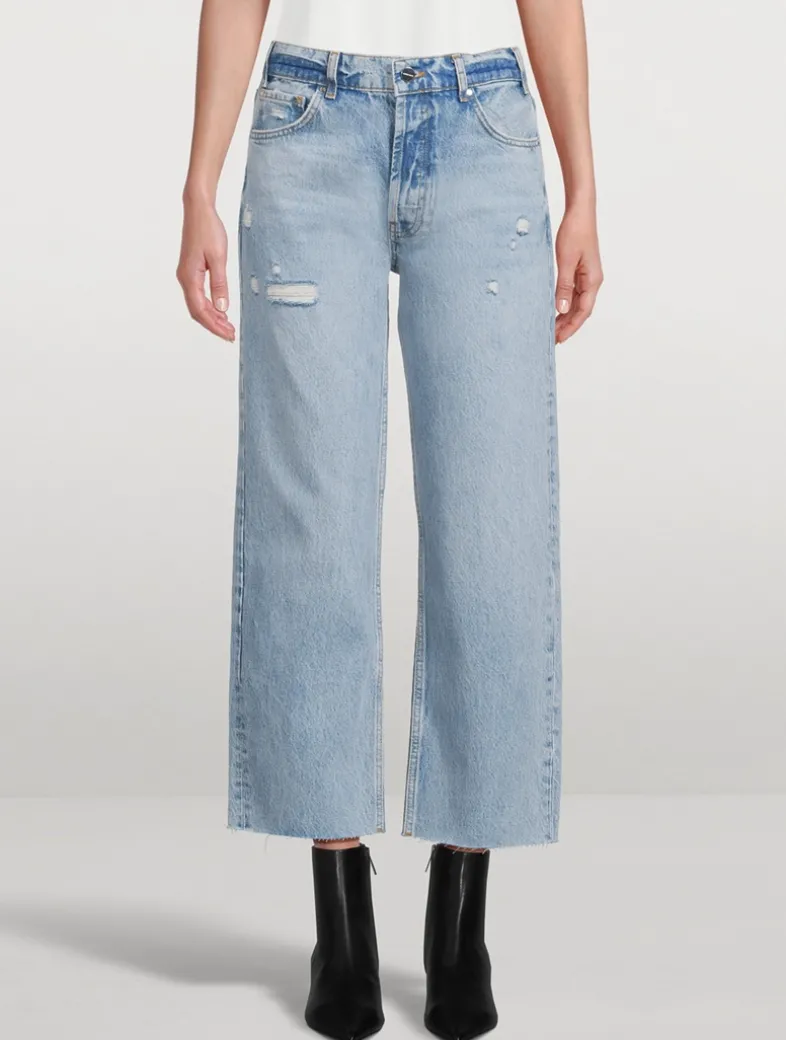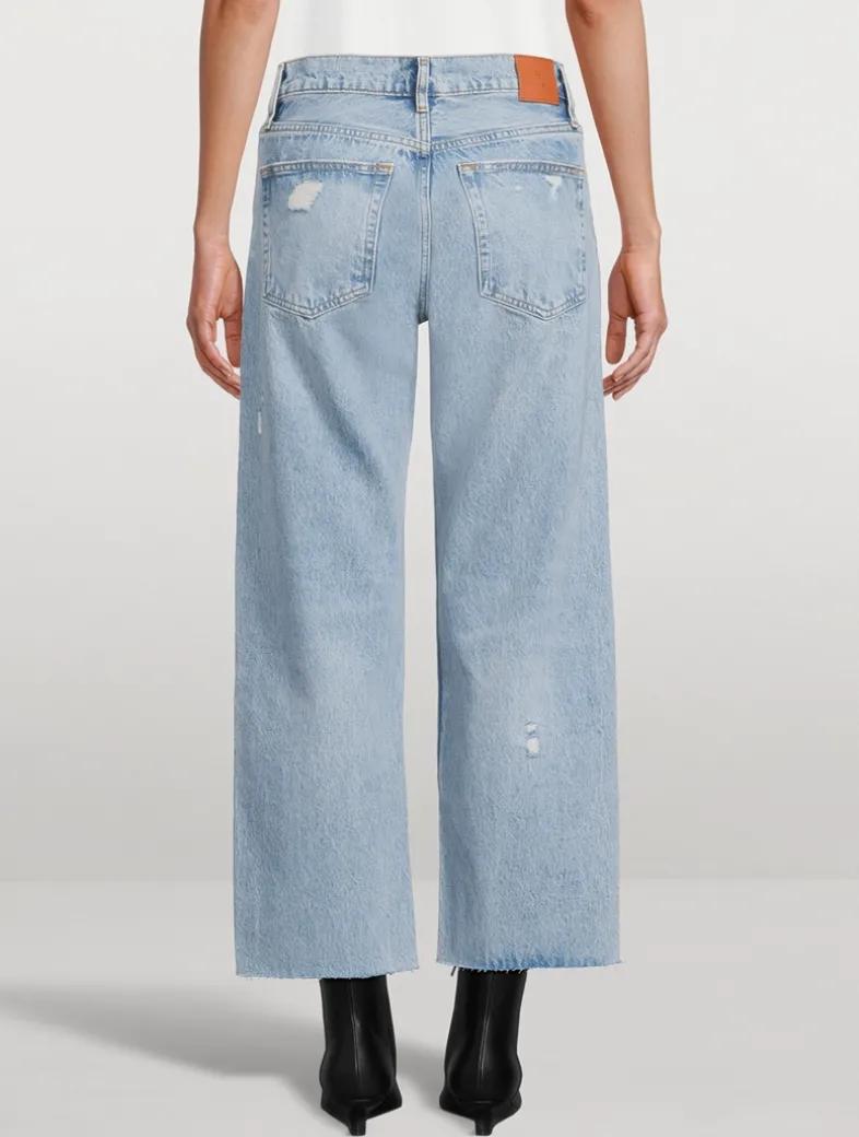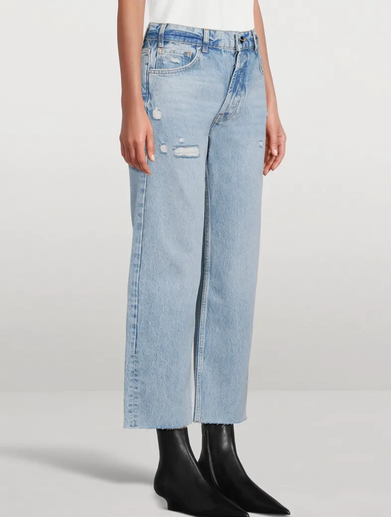 These cropped boyfriend jeans are cut from heavyweight 100% cotton rigid denim without stretch in a faded, light blue wash with grinding at both back pockets, marbling, and vintage-inspired highs and lows throughout. Finished with a raw-edge hem. Designed for a mid-to-high rise, relaxed-straight fit with a cropped inseam that grazes the ankle. Take your true size, or size up for a more relaxed fit.