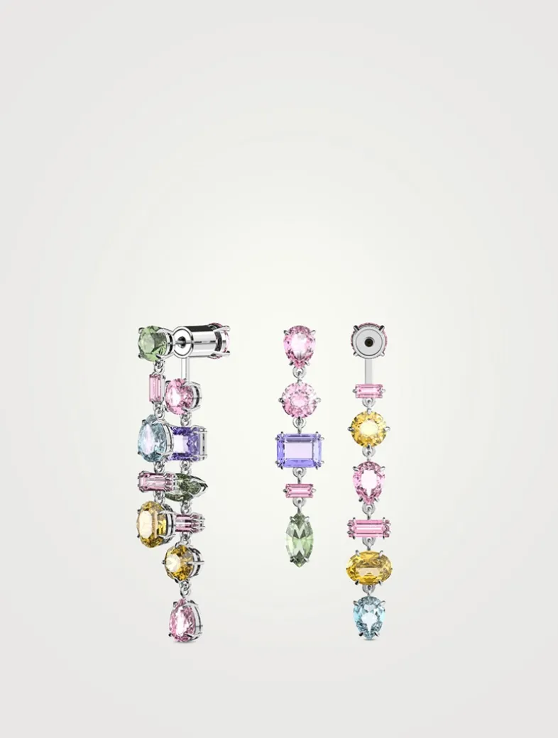 An asymmetrical threader design, these statement earrings feature mixed cuts of crystals in rainbow colours. The post back closure makes them easy and secure to wear.