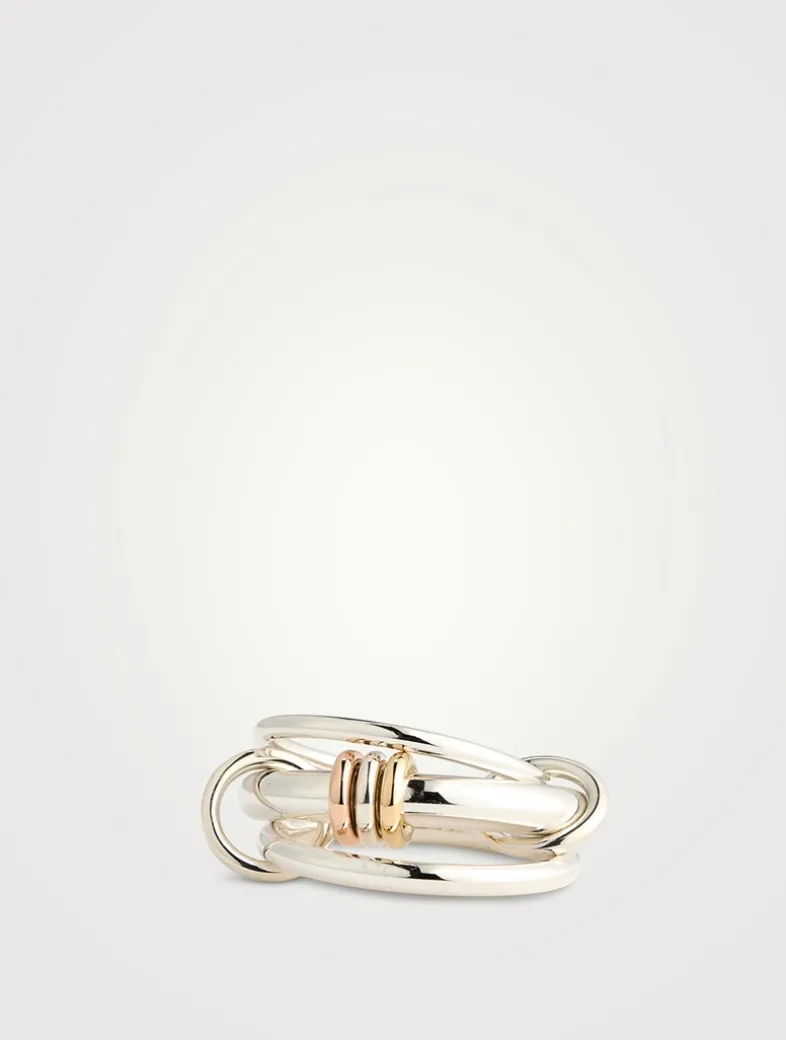 A signature stacked design, this piece features three linked rings in sterling silver with pavé diamond mixed metal accents and silver connectors.