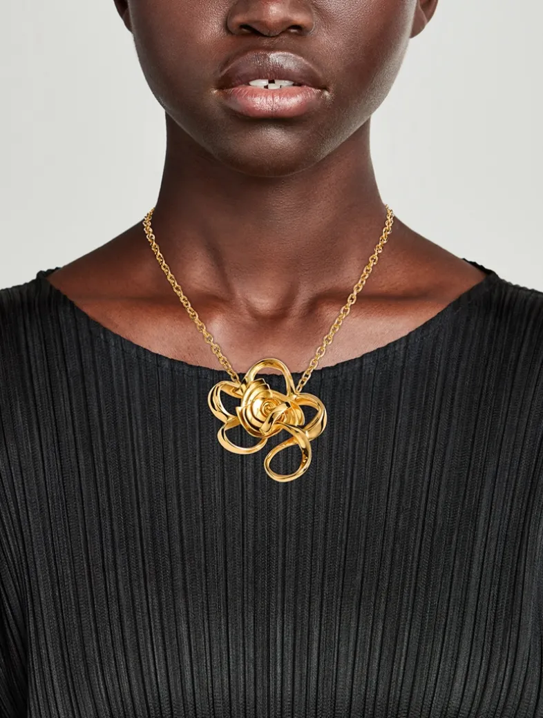 Crafted with a delicate gold-tone chain, this necklace showcases a statement pendant sculpted into a striking geometric rose.
