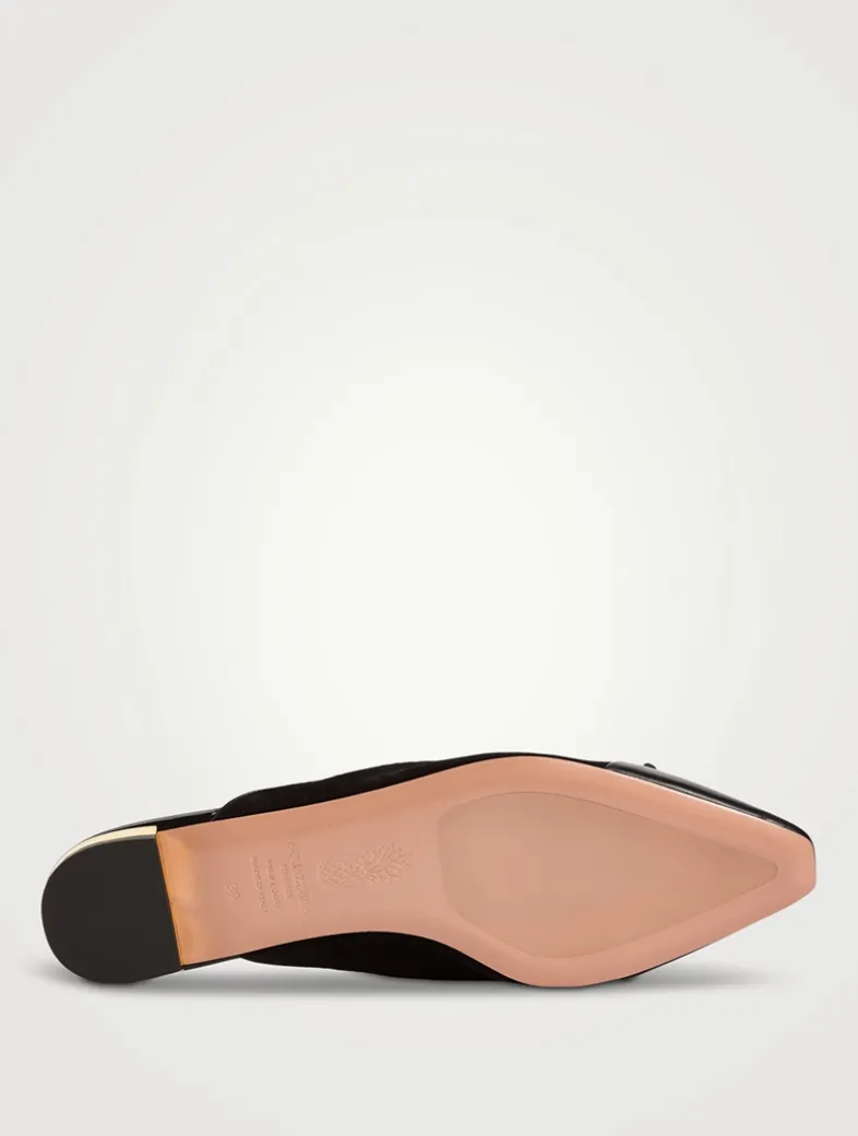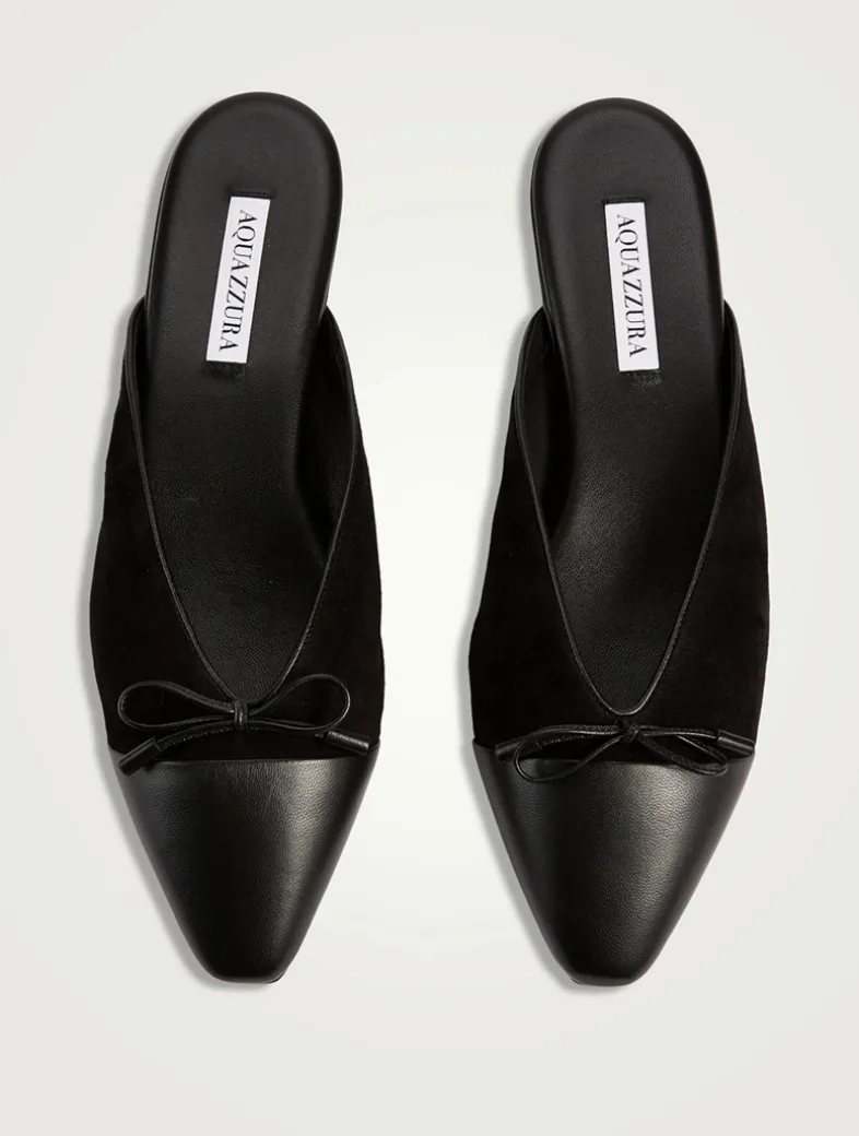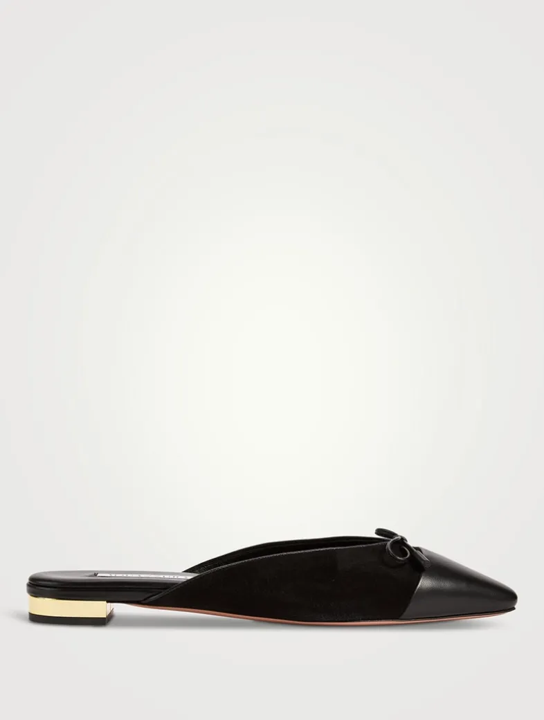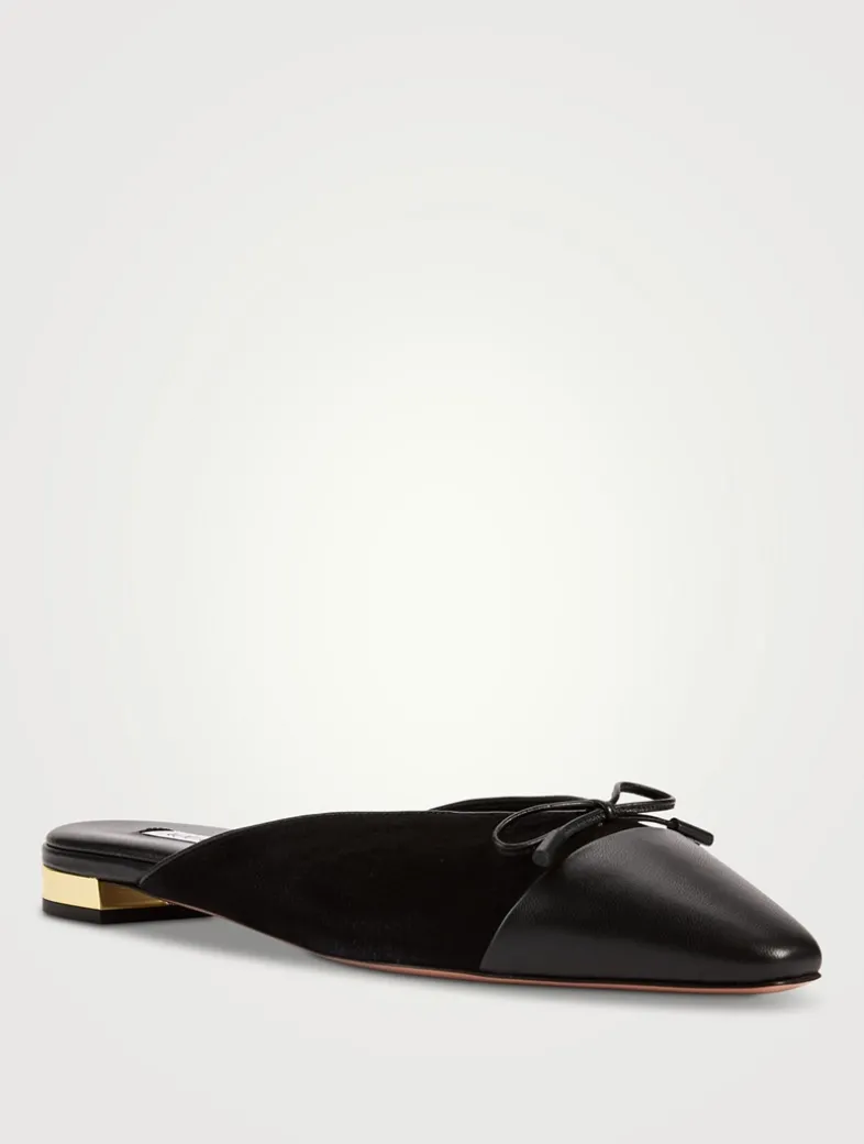 Embodying Parisian chic, the Gioia mules are crafted in Italy from soft suede, with squared-off leather toe caps and a delicate bow that nods to ballet shoes. Set on Aquazzura’s trademark metallic heel.