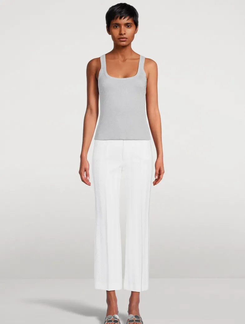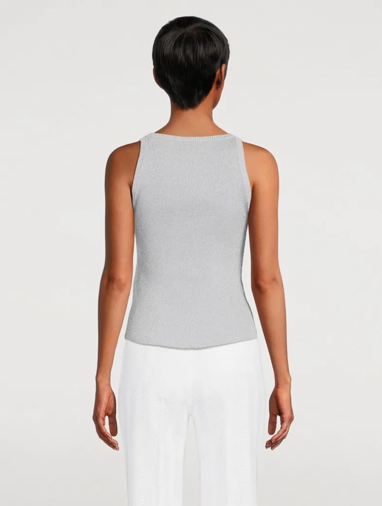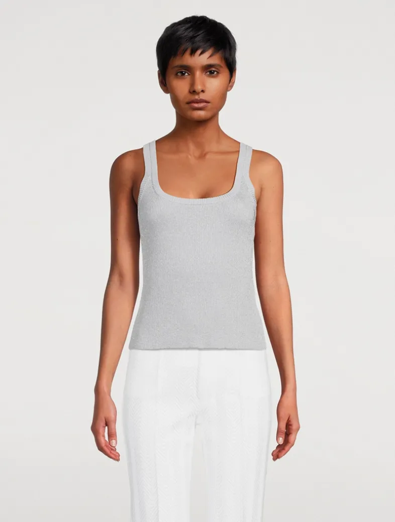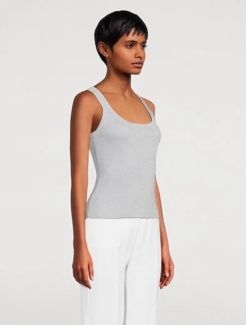 Glitter viscose for a multi-faceted effect: this is how the tank top with a wide rounded neckline takes on a