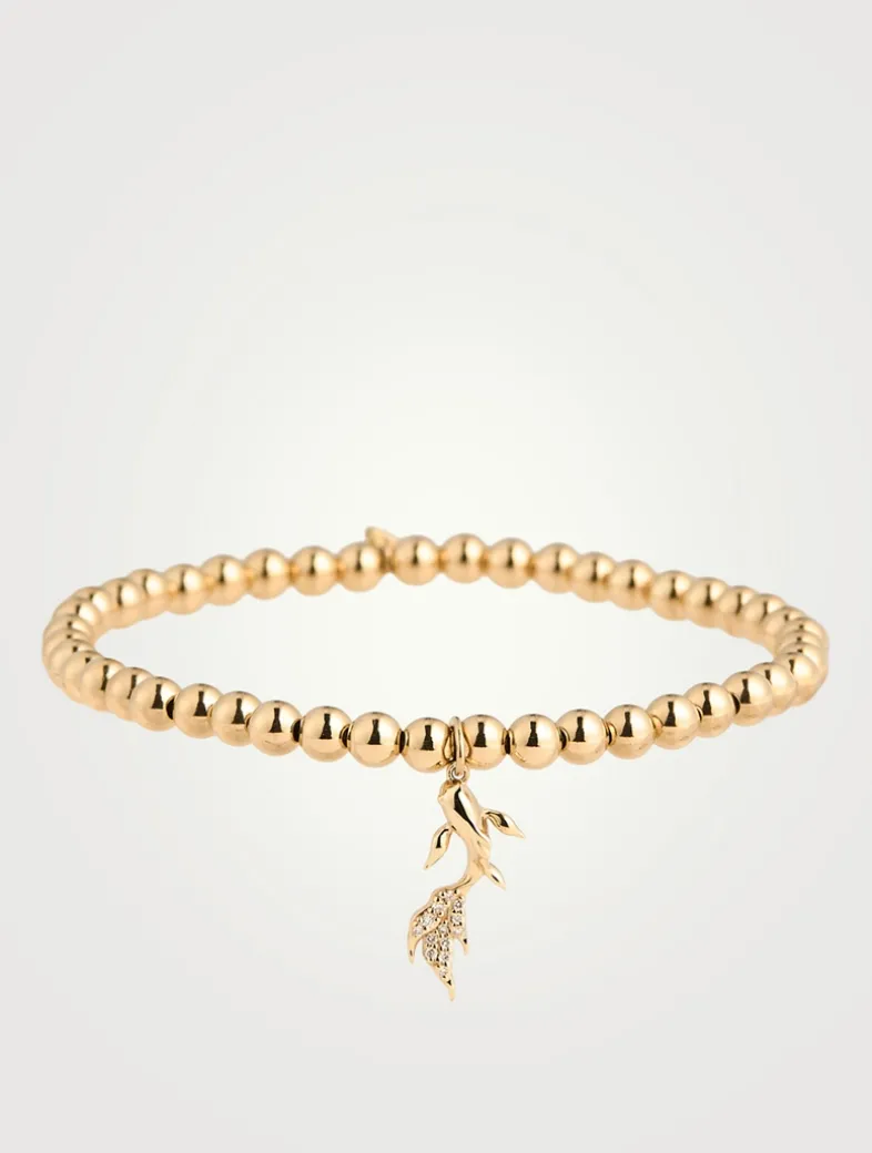 Made from smooth golden beads, this slip-on bracelet is detailed with a 14k gold and pavé diamond koi fish charm. All Sydney Evan beaded bracelets are strung on a stretch cord along with our 14k gold SE logo charm.