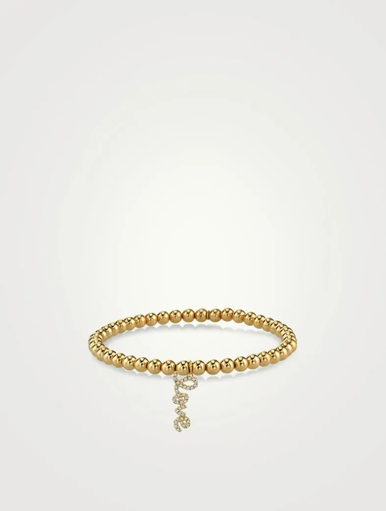 Strung with round golden beads, this bracelet features a 14k yellow gold and diamond love script charm. All SYDNEY EVAN beaded bracelets are strung on a stretch cord along with their 14k gold SE logo charm.