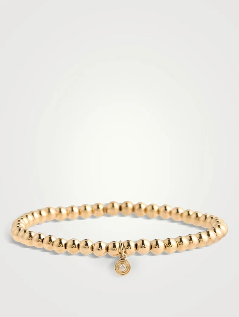 Strung with golden beads, this slip-on bracelet features a small fluted charm with a single diamond. All Sydney Evan beaded bracelets are strung on a stretch cord along with a 14k gold SE logo charm.