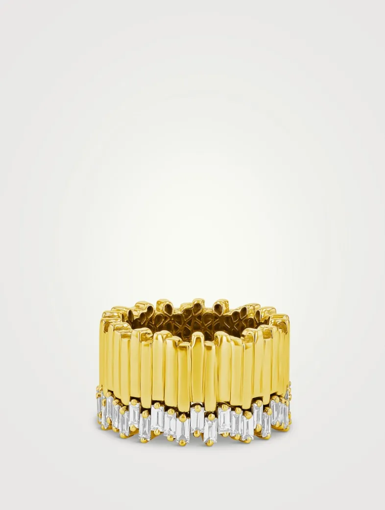 This eternity band connects a row of vertically set diamond baguettes to a larger row of gold bars. The addition elevates the ring to a new dimension.