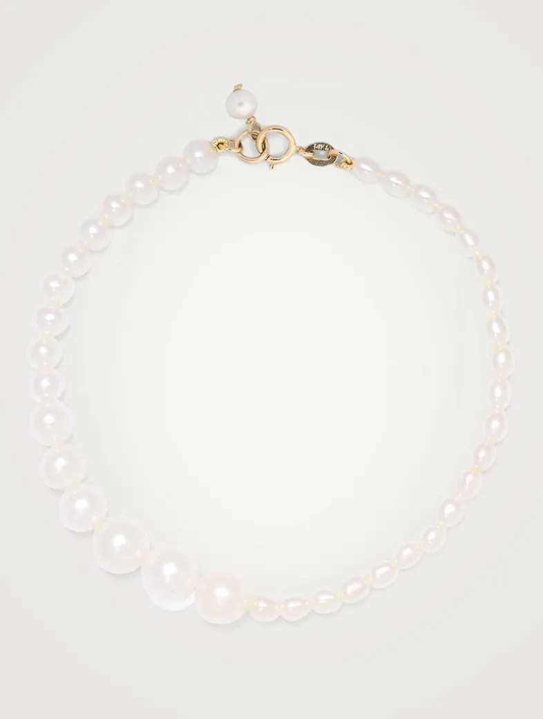 Handcrafted in Vancouver, Canada, this pearl strand bracelet features white round pearls arranged from large to small on one side, paired with small oval Keshi pearls on the other, offering a sleek, modern twist.