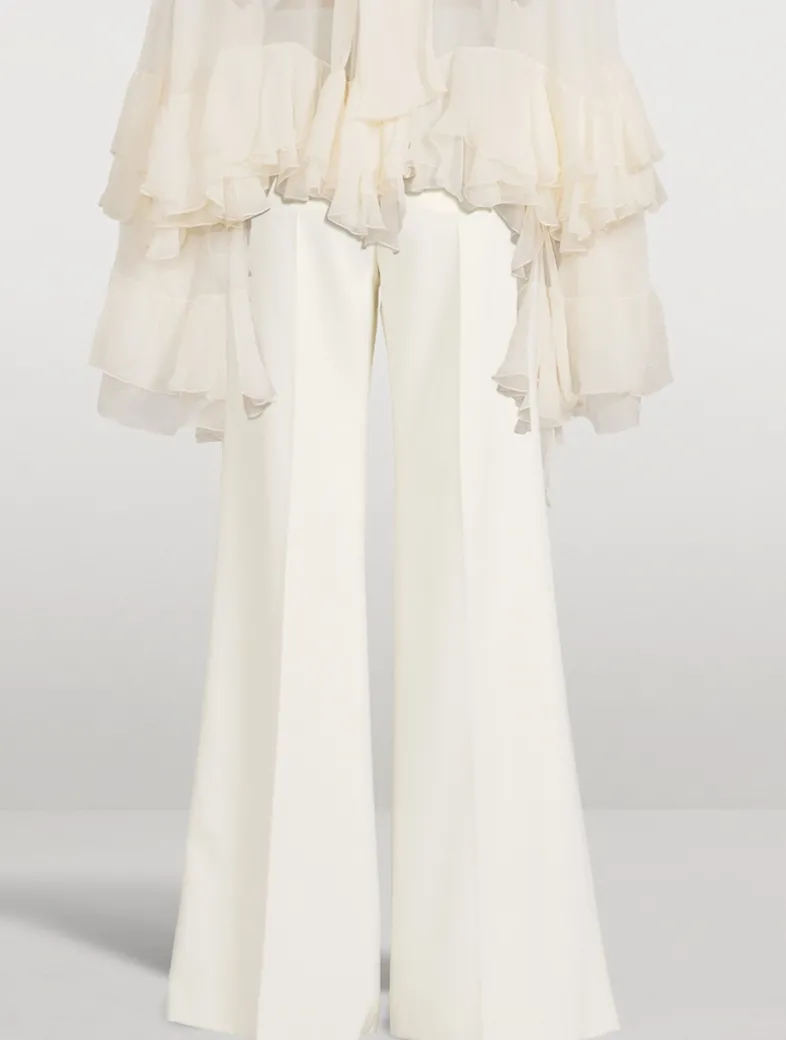 Cut to a high-rise silhouette, these flared trousers are made in lower-impact wool grain de poudre with pressed front creases. They feature belt loops, side pockets, and topstitched back pockets.