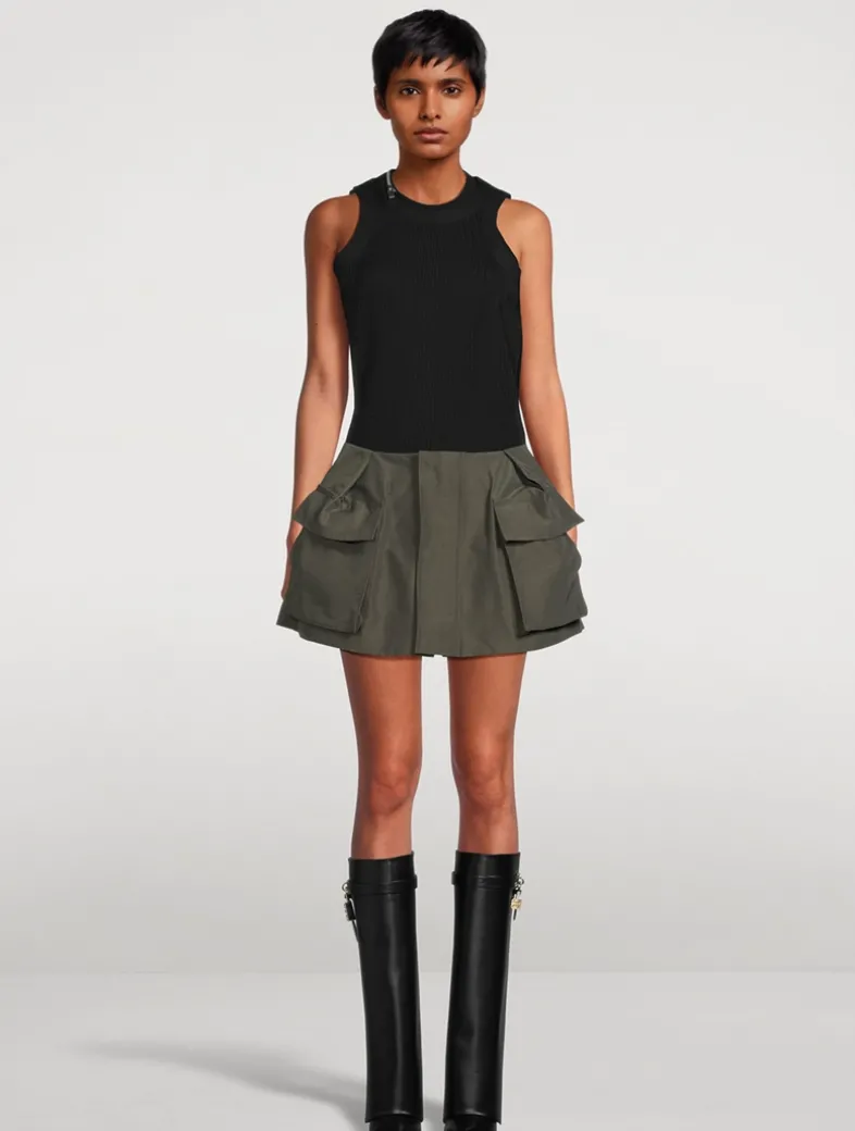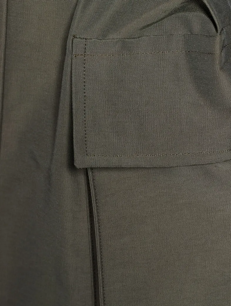 Made in Japan from cotton-blend grosgrain, this mini mixes a playful silhouette with rugged styling. It is cut to sit high on the waist and fall to a flared shape with a concealed front closure and cargo pockets at the sides.