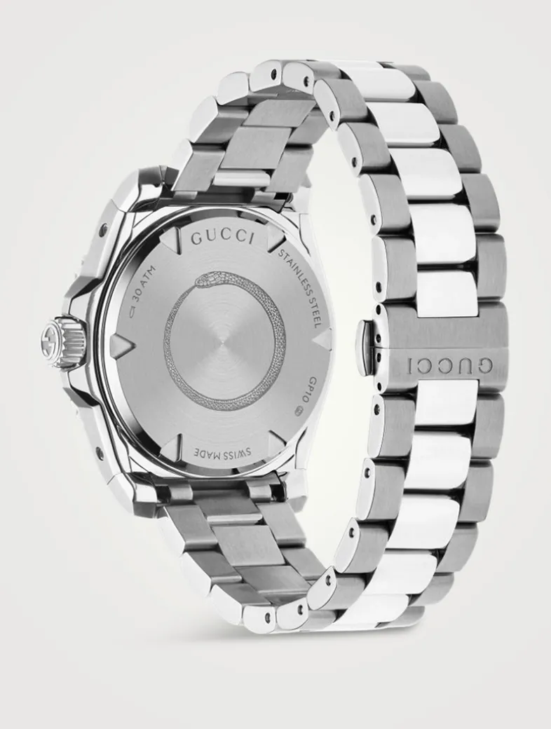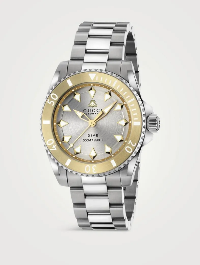 The recognizable Gucci Dive watch continues to explore emblematic House codes in new ways. A historic Gucci symbol, the bee appears as a subtle detail atop the accessory. Designed with a silver dial, the watch is completed by a gold plated bezel and a steel bracelet.