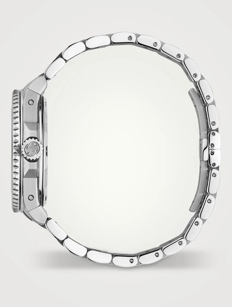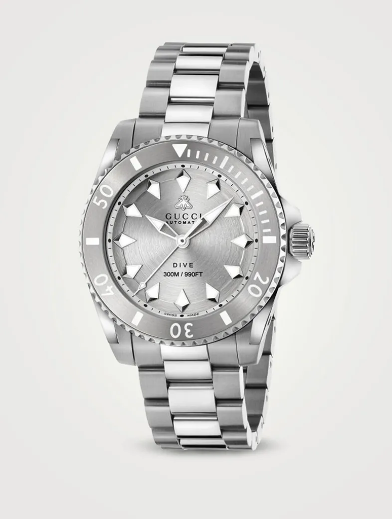 Marked by its diver’s watch inspired design, here the Gucci Dive appears with a silver dial with bee and a steel bracelet. Taking inspiration from the archives, the latest collection reimagines emblematic codes with a contemporary spirit.
