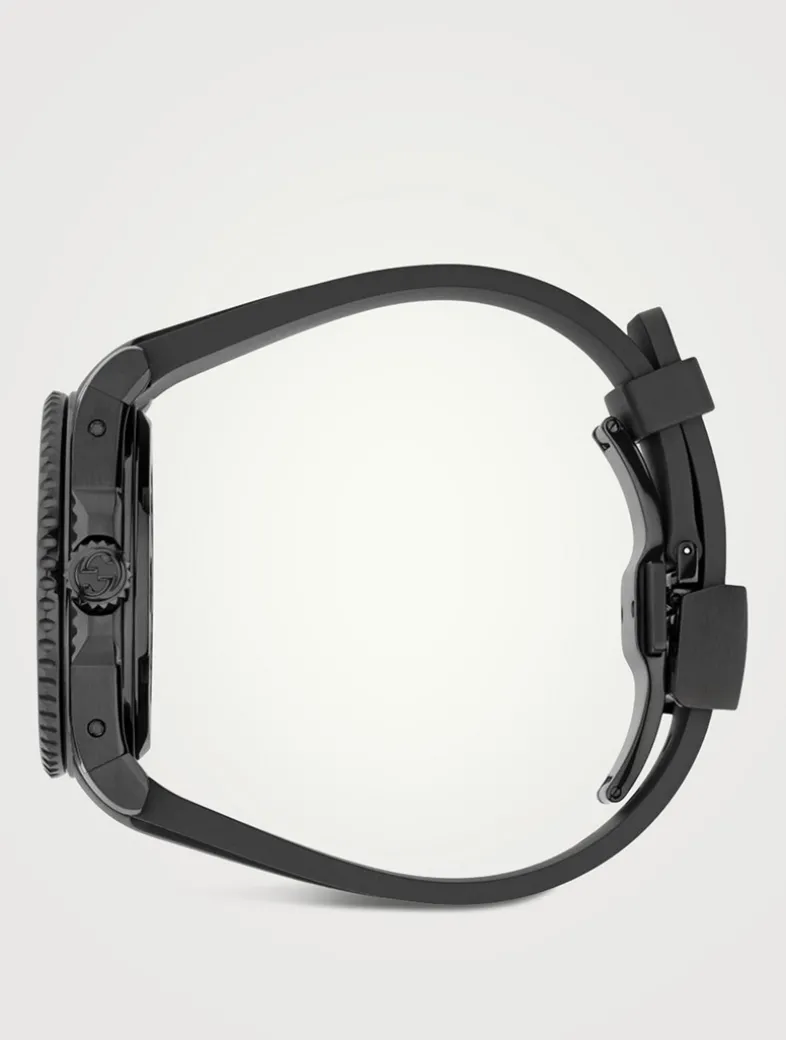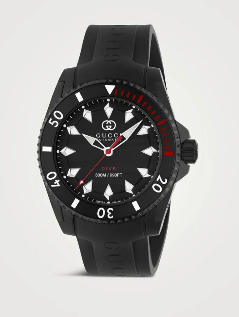 The Gucci Dive line continues to explore the House codes in contemporary ways. Designed with a steel case and a rubber strap, this watch features a black dial and ceramic bezel. A automatic movement powers the piece.
