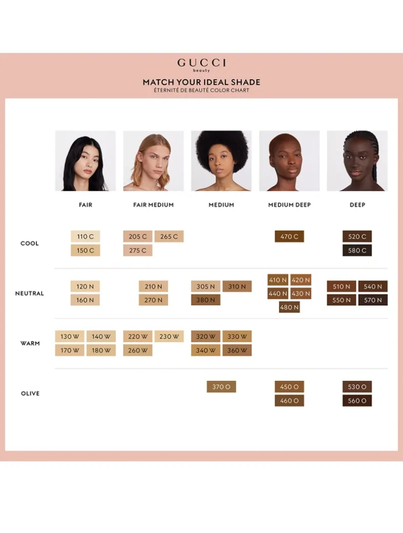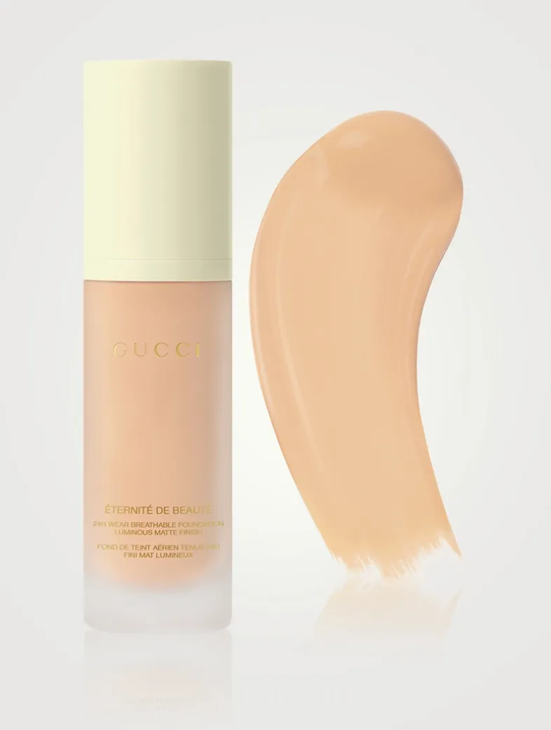 Gucci Éternité De Beauté foundation stays on the whole day, no matter how you play. This 24H, long-lasting Gucci foundation delivers a luminous-matte finish and a full coverage in one drop, while feeling breathable, weightless, and comfortable. The surprisingly thin texture of this matte foundation stretches for all over beautification. Available in 40 shades.
