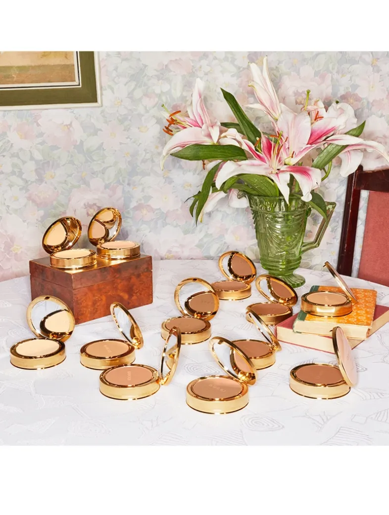 Encased within a pale pink refillable click compact with GUCCI lettering, gold trim and a mirror, this buildable face powder creates a unified complexion to look naturally perfected. Offering a lightweight, visibly smooth texture the skin looks mattified with a natural finish. A brilliant combination of micro reflecting lamellar powders spread smoothly on the skin surface for a unified complexion, while emollient agents provide comfortable feel all day long. The powder is boosted by a delicate floral fragrance, enveloping the senses as it comes in to contact with the face.