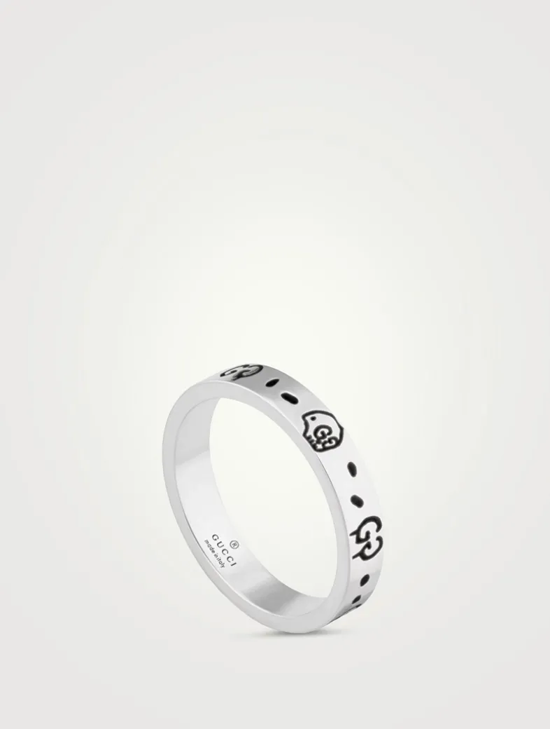 This ring in silver is engraved with GucciGhost motifs by artist Trouble Andrew and Alessandro Michele.