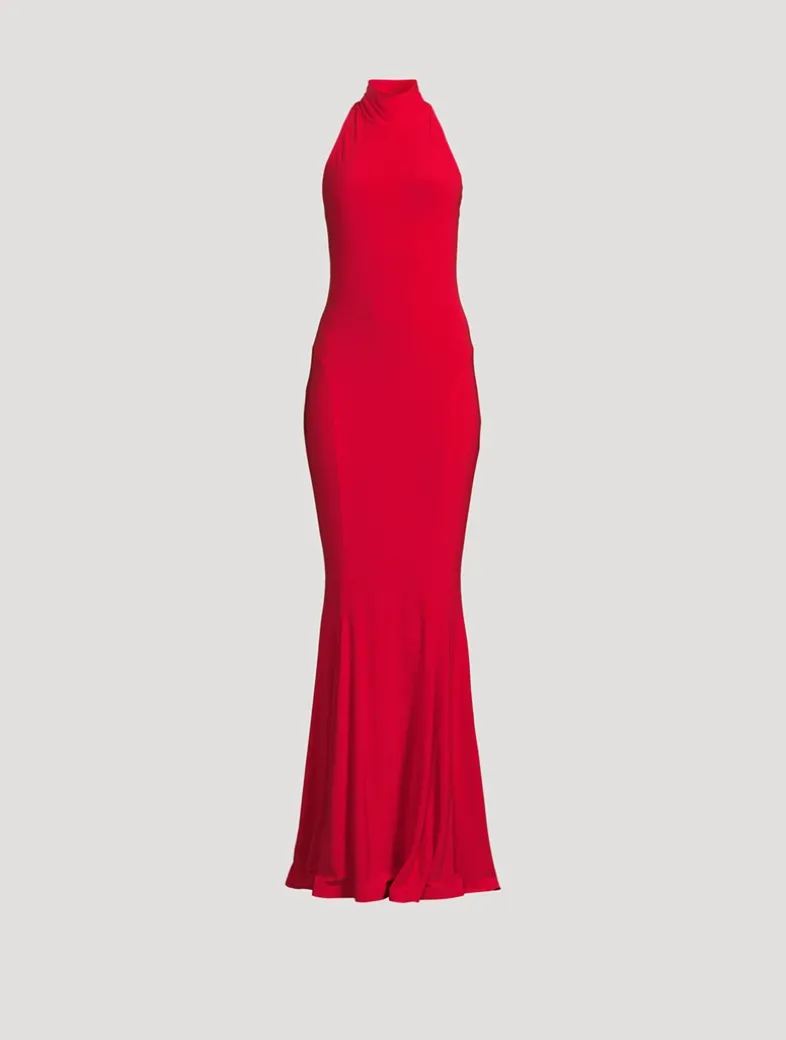 Flaunting a high neckline, this sleeveless halter gown is designed with an open back and an elegant fishtail hem.