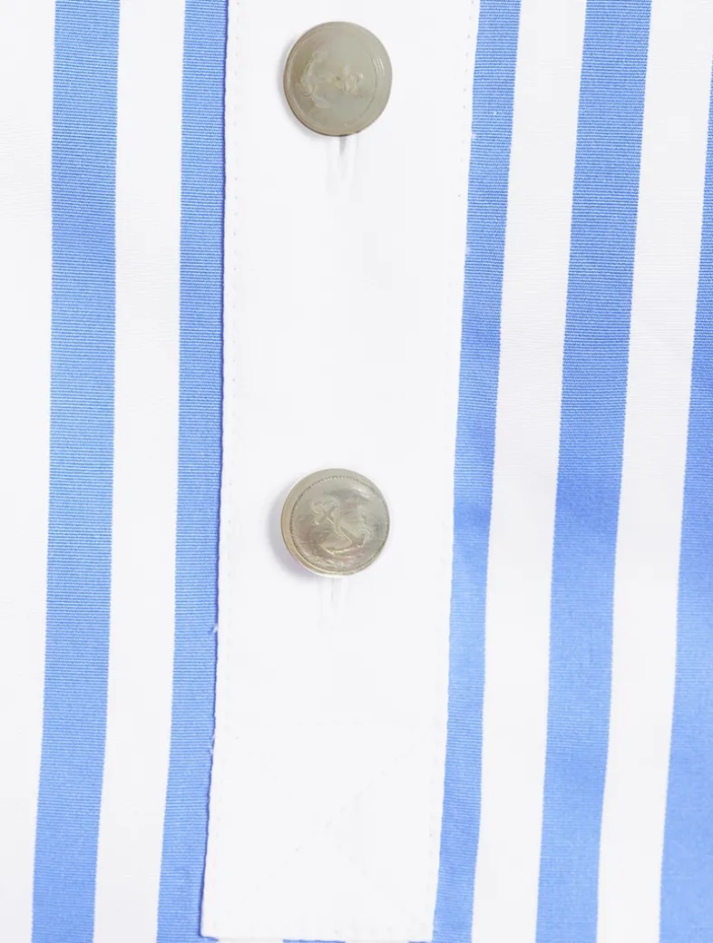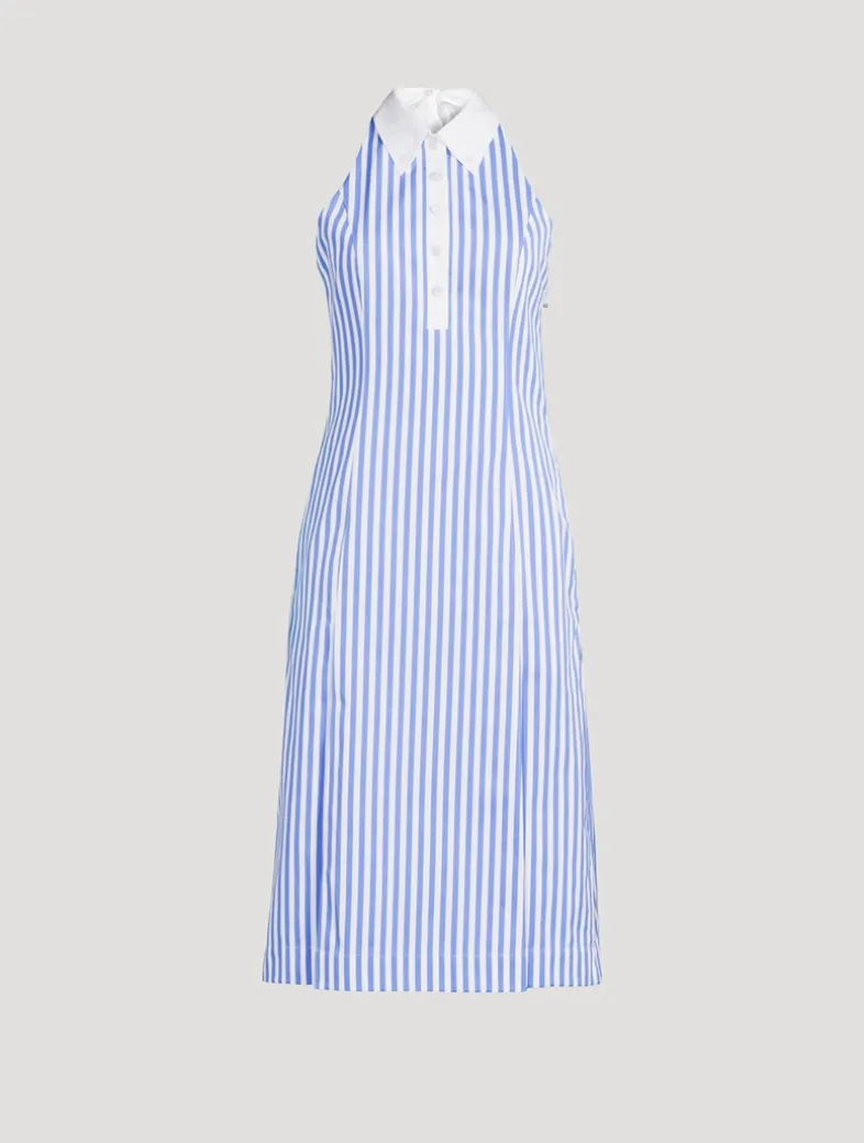 Crafted from crisp cotton poplin with classic stripes and solid trim, this timeless midi dress seamlessly blends country life charm with modern sophistication. A true classic, perfect for any occasion.