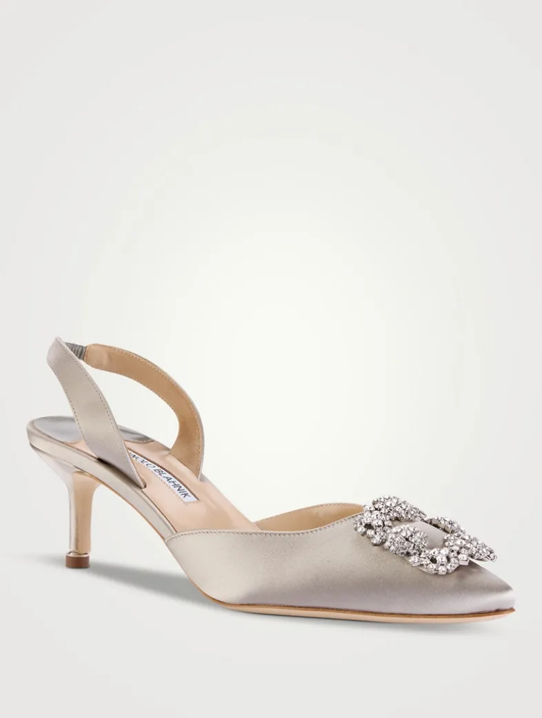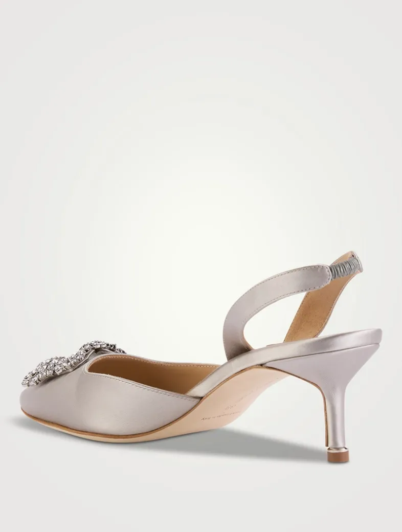 Inspired by Napoleon I, Josephine, and Pauline Bonaparte, these pumps are embellished with the signature crystal buckle. They are crafted from satin with an elasticated slingback strap and a kitten heel.