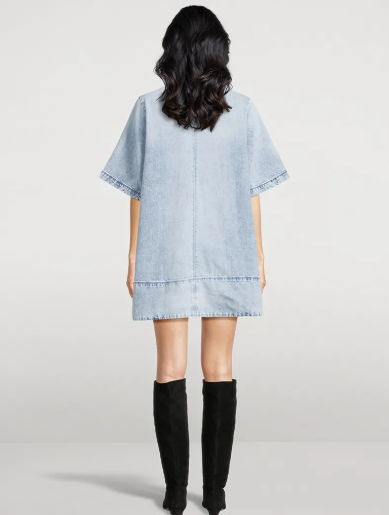 Effortlessly easy and perfect for everyday, this mini is featured in a soft denim fabrication and voluminous silhouette with a crew neckline and relaxed short sleeves.