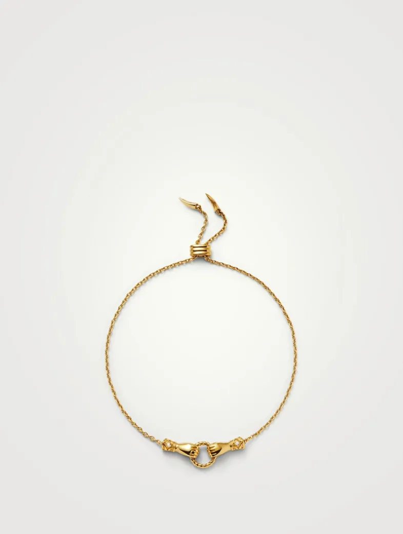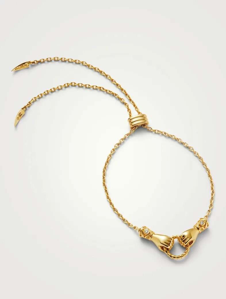 Inspired by the Harris Reed x Missoma ‘In Good Hands’ design. Set on a simple chain, the adjustable slider bracelet can be worn at any length you’d like—a comfortable fit for everyone. Two Georgian-inspired hands come together in the iconic pendant. Intricately detailed, each cuff has been illuminated with white cubic zirconia and features a ring with a black enamel. Wear solo for a more minimalist look or stack with beaded styles for a pop of colour.