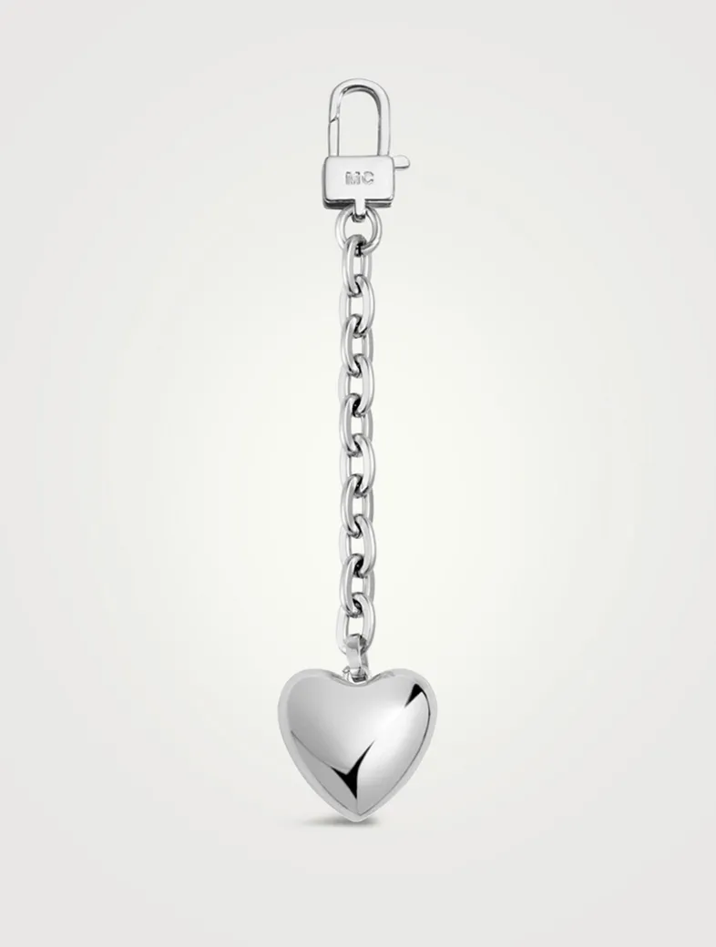 Handmade in the United States, this heart chain bag charm is finished with polished rhodium plating.