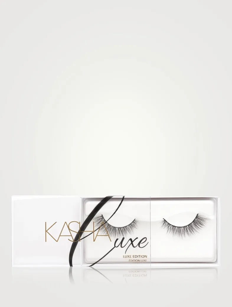 Kasha Luxe Edition lashes are made with synthetic silk fibres, offering a soft and lightweight feel. They are set on a flexible cotton band for optimal comfort. Kasha’s products are cruelty-free, vegan, and handcrafted with precision.