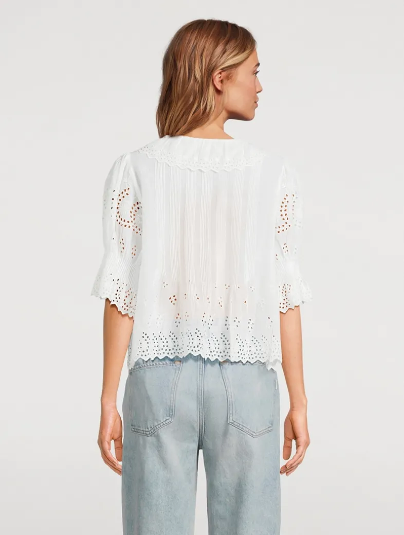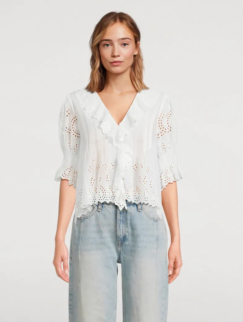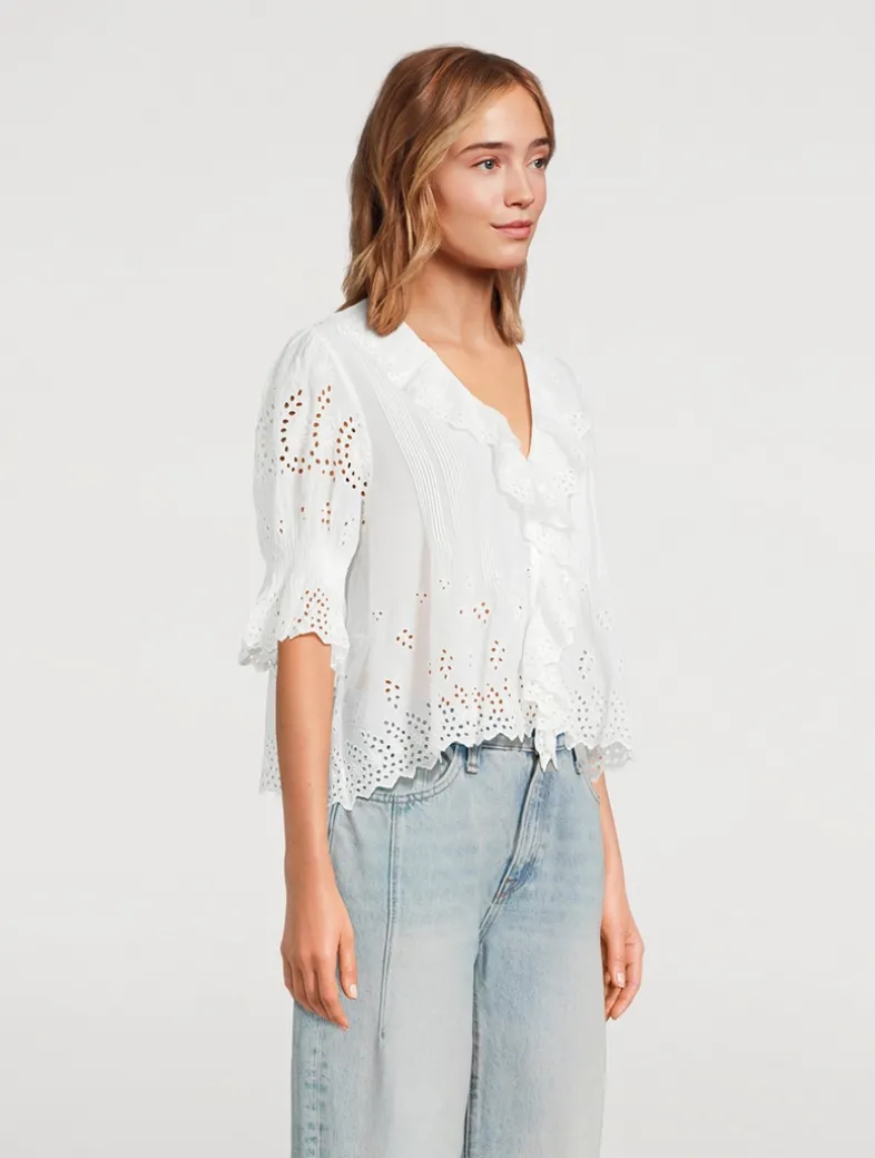 Crafted from soft organic cotton voile and detailed with eyelet, this top features a plunging V-neckline framed with cascading lace-trimmed ruffles that extend down the bodice and delicate clustered pintucks at the yoke, back, and short puffed sleeves. A line of hidden starburst buttons run up the center front.