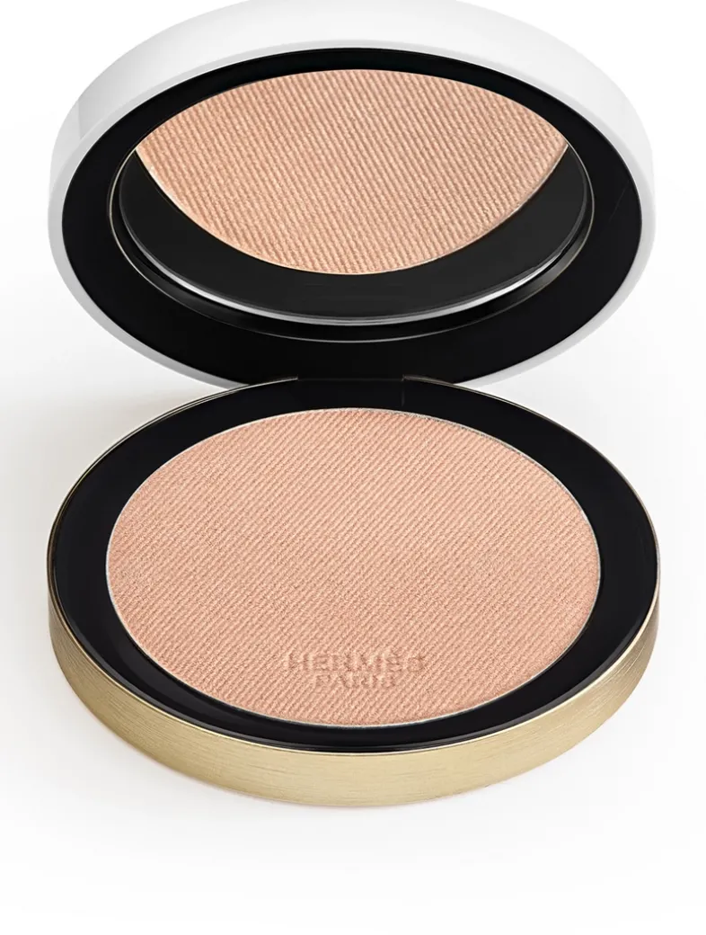 Beauty embraces the open air with the radiant matte powder, a soft, silky finishing powder that mattifies the complexion with a translucent glow. In addition, beauty embraces the open air with the radiant glow powder, a fine, silky powder that enhances the complexion with luminous radiance. The formula contains emollients for long-lasting softness and comfort. Its round case with off-center mirror is a disc of light in white and gold designed by Pierre Hardy. A lightweight object, it was created for use on the go. Slipped into its orange box, it is a pure Hermes object.