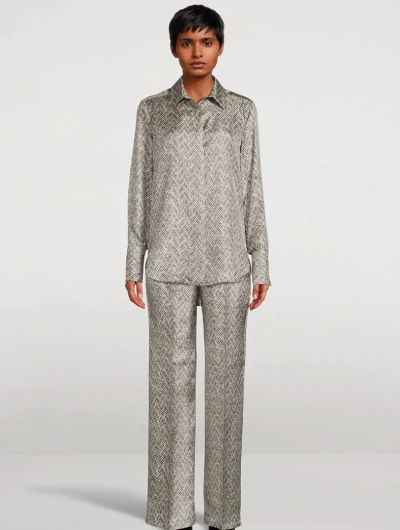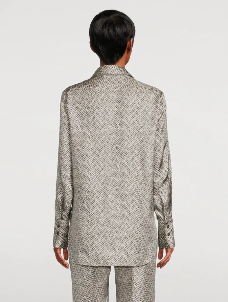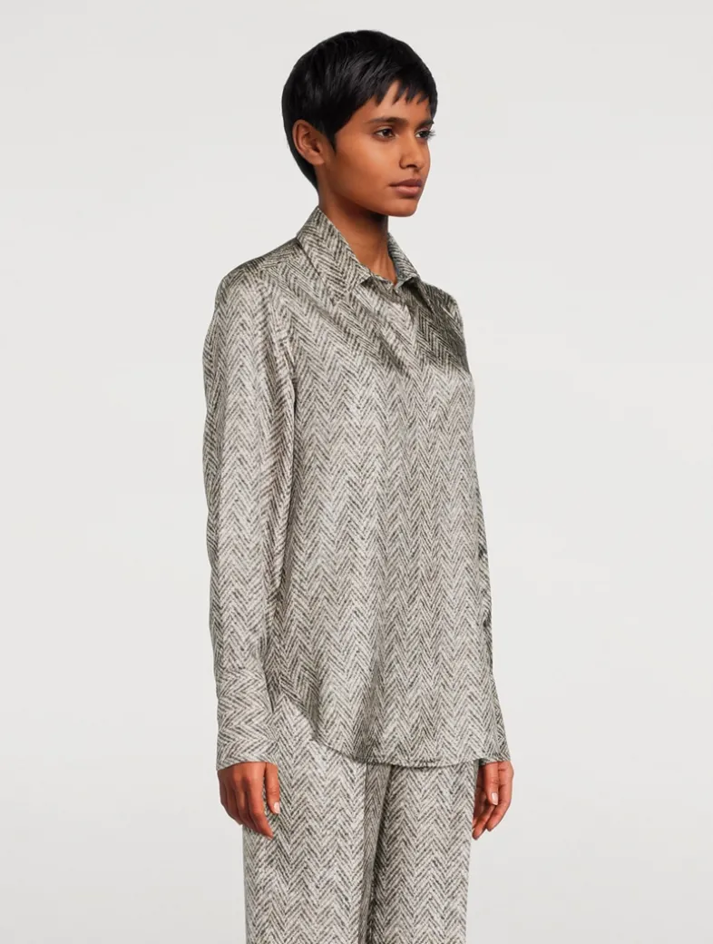 Made in Italy, this silk shirt is printed with a graphic herringbone motif. Classic lines are reinterpreted with a slightly extended length and oversized fit, adding a contemporary twist to a timeless design.