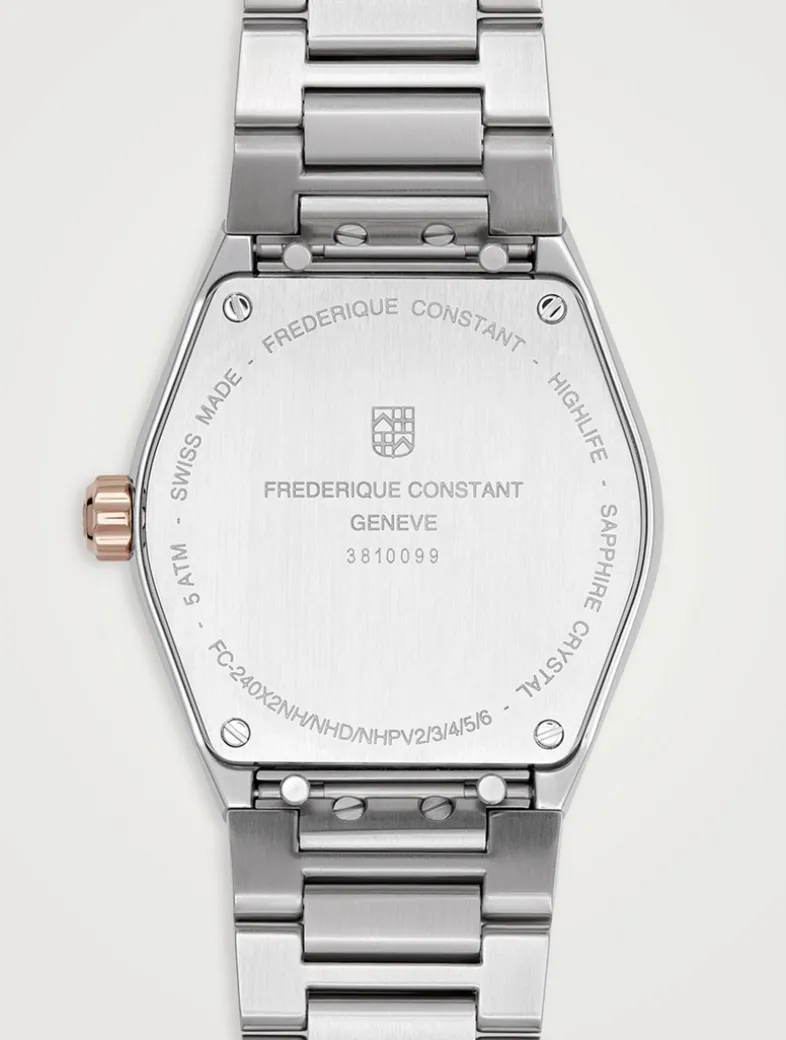 With a two-tone rose gold plated stainless steel case, this watch from Fréderique Constant is an elegant and versatile choice. The grey dial is embellished with 8 diamond markers and rose gold plated hands.
