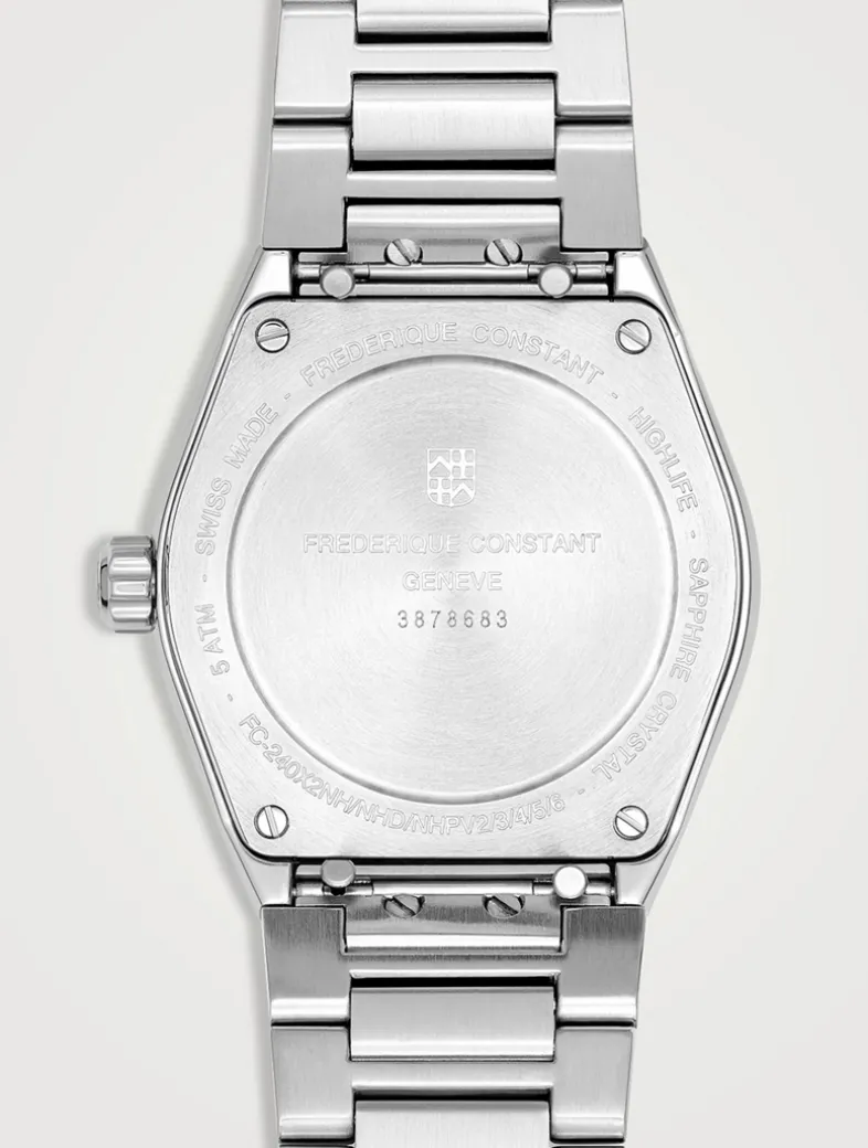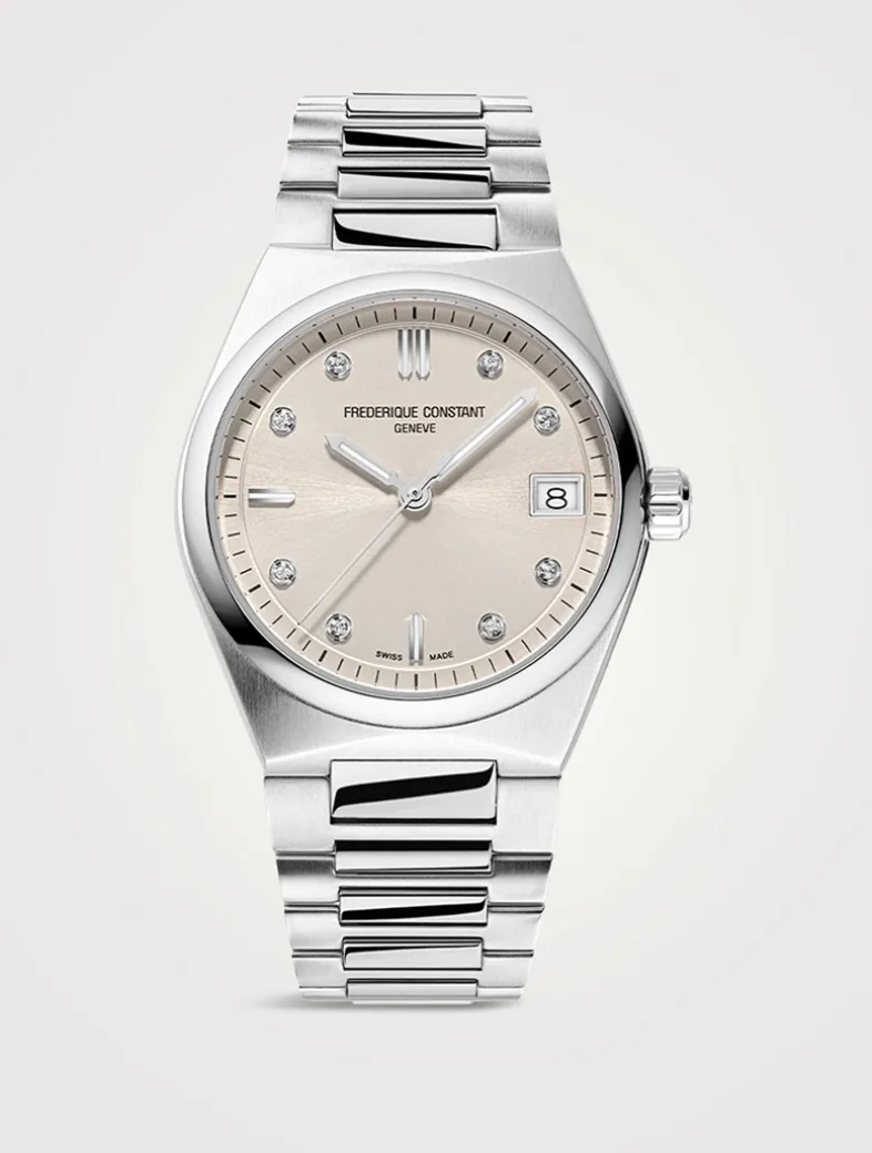 This Highlife Ladies Quartz features the integrated and interchangeable bracelet that has become the hallmark of the collection. Featuring a date window, this style has a silver-tone dial with sunray finishing, accented by silver and diamond indexes. The frosty theme continues to the brushed and polished stainless steel 3-link bracelet.