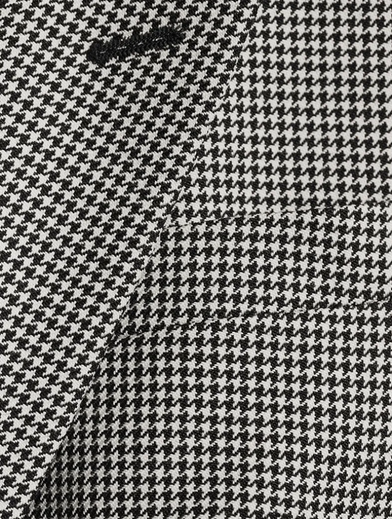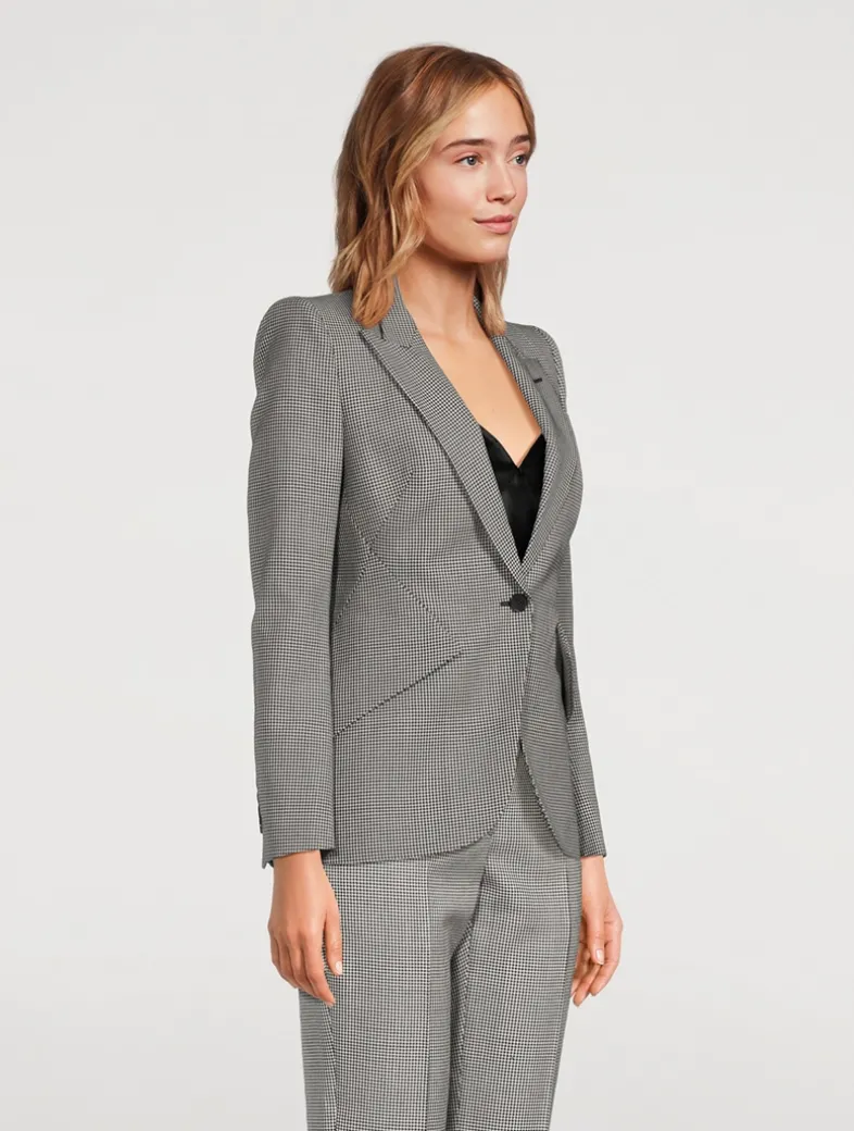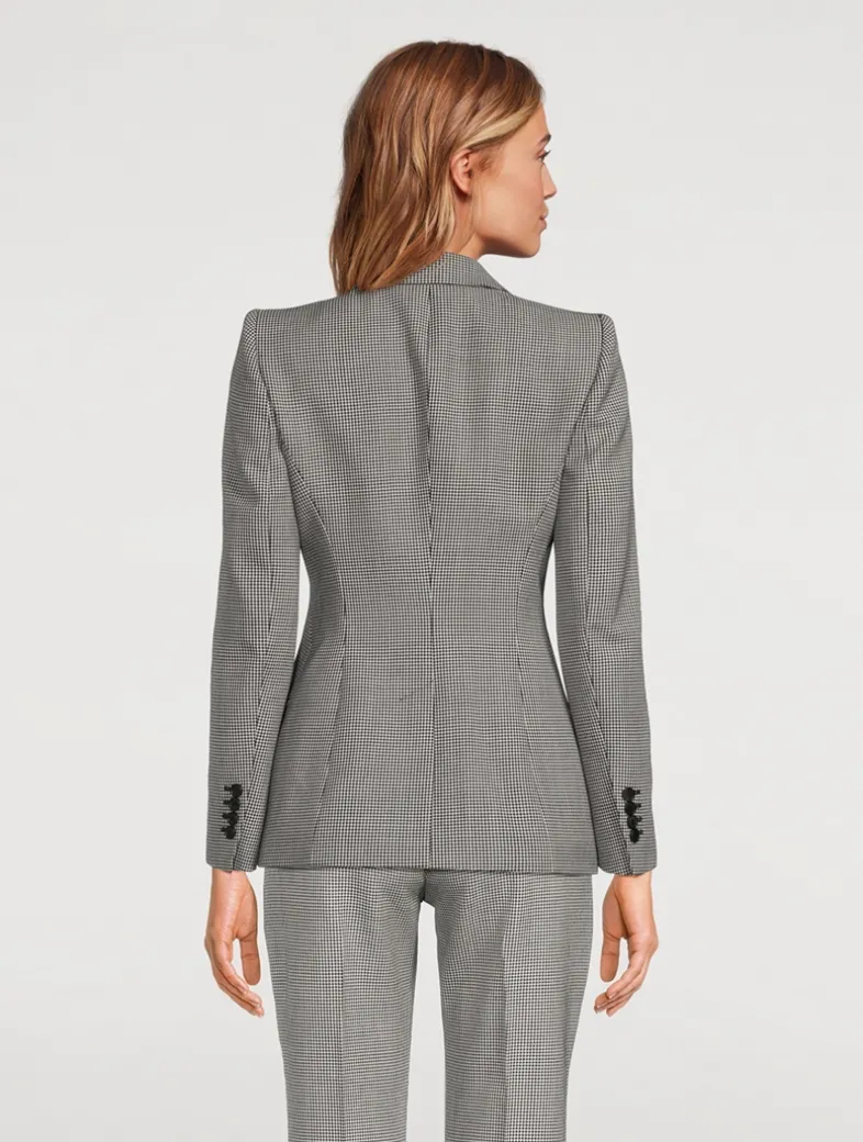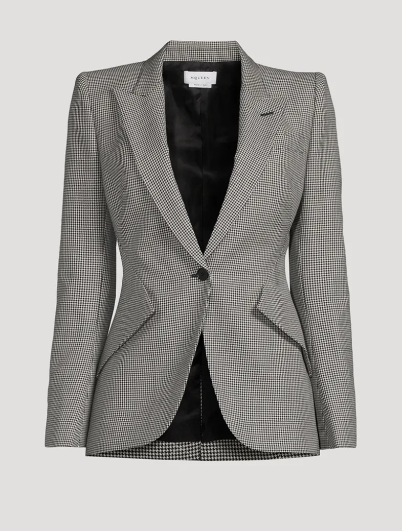 Clean and classic with a single-button closure, this blazer is crafted from a blend of wool and mohair with a classic houndstooth motif. The signature McQueen edge is found in padded shoulders and a nipped-in waist.