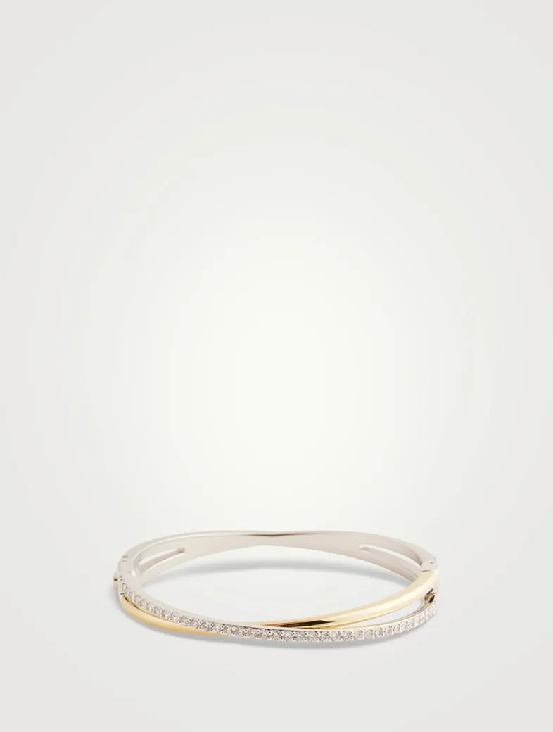 This twisting Hyperbola bangle is crafted with unmistakable Swarovski savoir-faire. The two overlapping bands are presented in a mix of gold-tone and rhodium plating, with round Swarovski Zirconia placed in a prong setting.