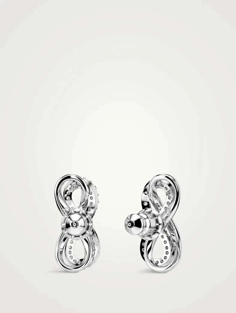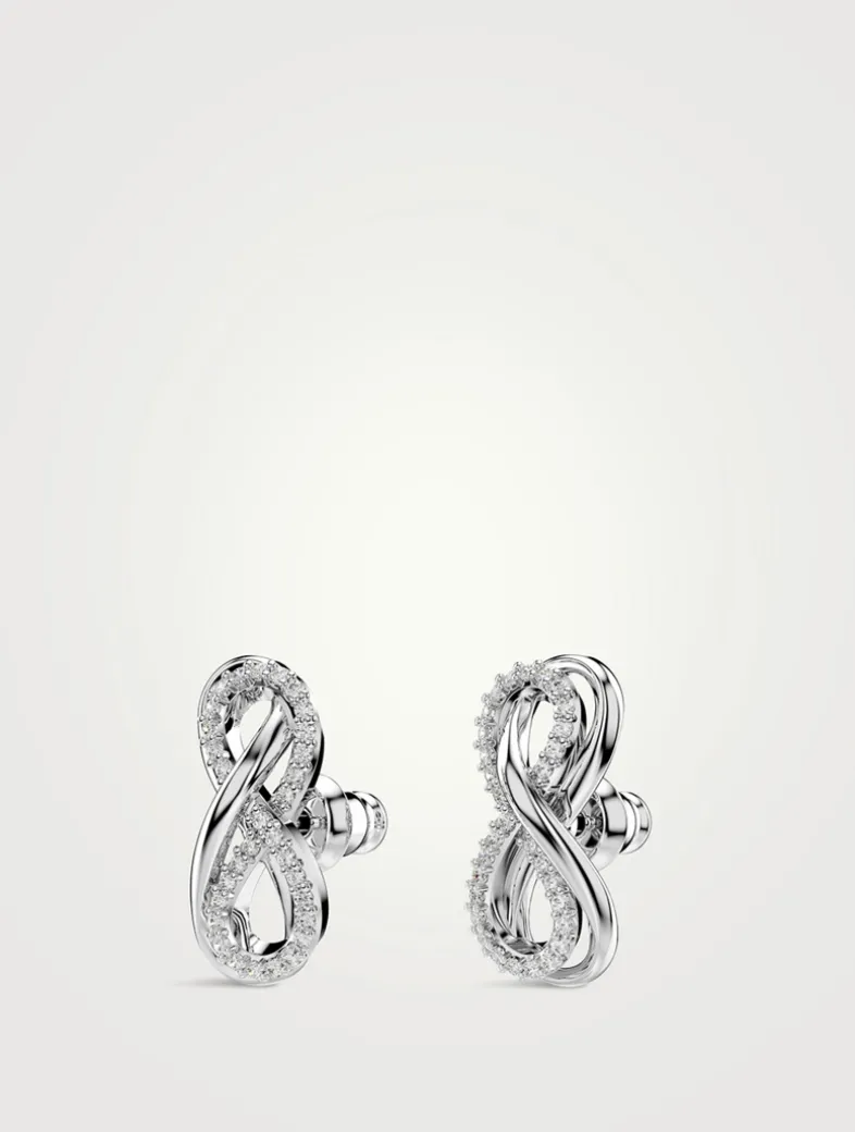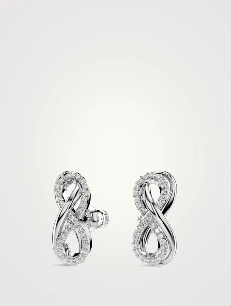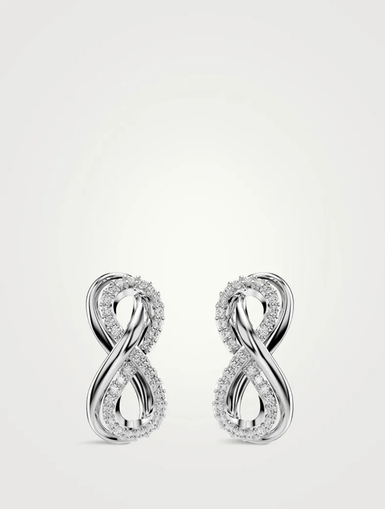 Each rhodium-plated piece is crafted in the shape of an infinity motif and adorned with an array of clear Swarovski Zirconia.