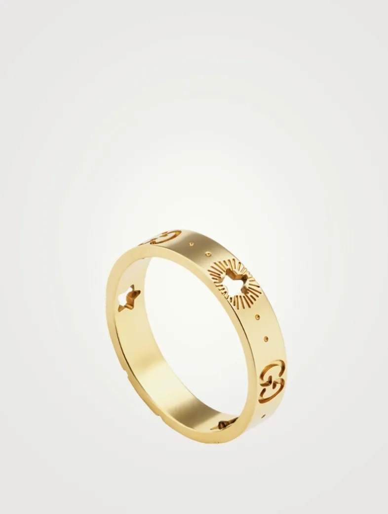 From the Icon Collection. Influenced by the world of astronomy, this band features cut-out stars and engraved Double G motif. Hypoallergenic and nickel-free. In line with the brand’s sustainability strategy, GUCCI gold, platinum and diamonds are certified by the Responsible Jewellery Council whose mission is to promote responsible, ethical, social and environmental practices that guarantee human rights throughout the gold and diamond supply chain, from mines to retail.