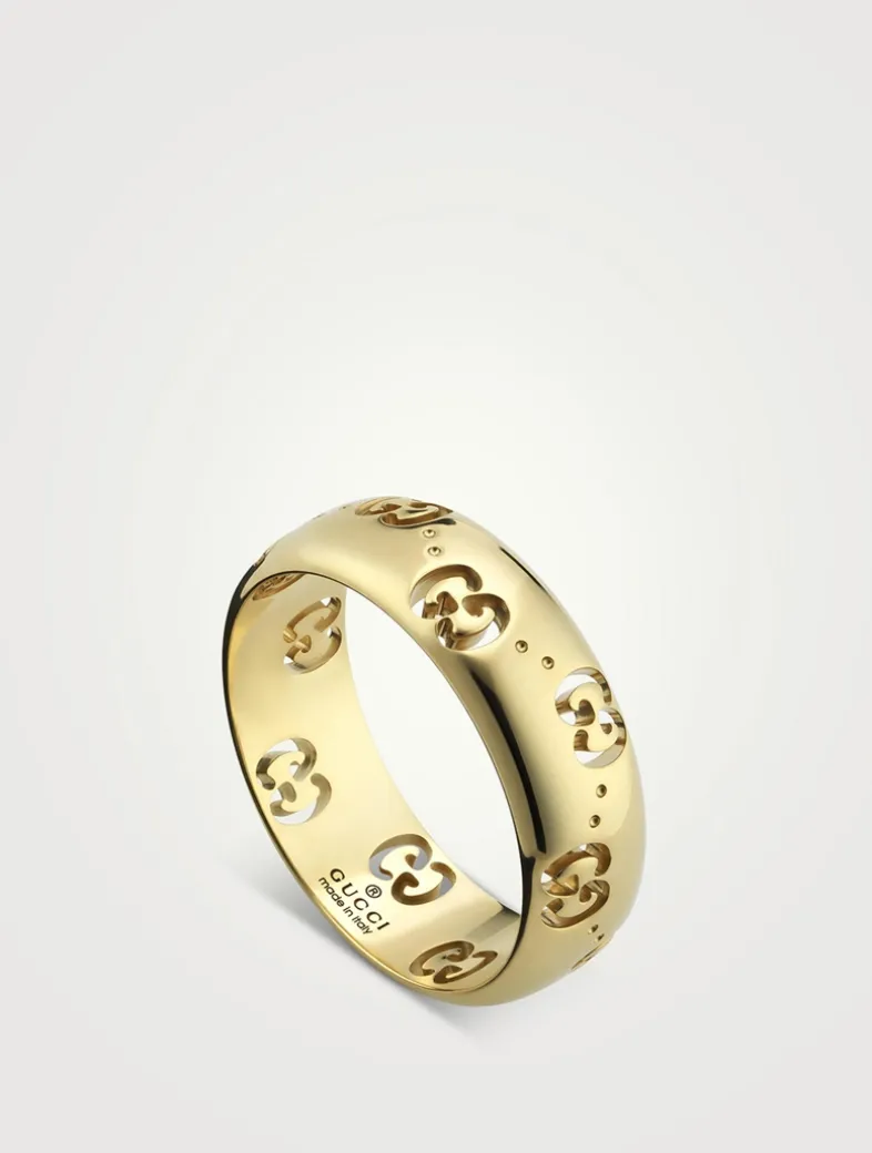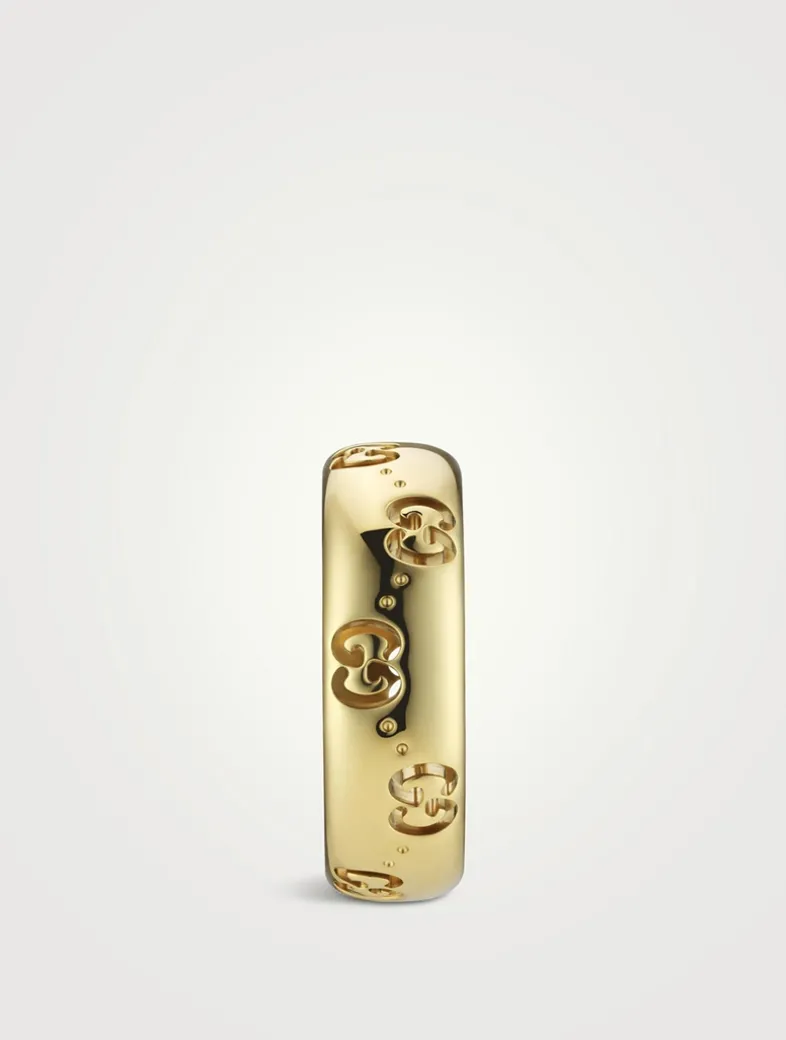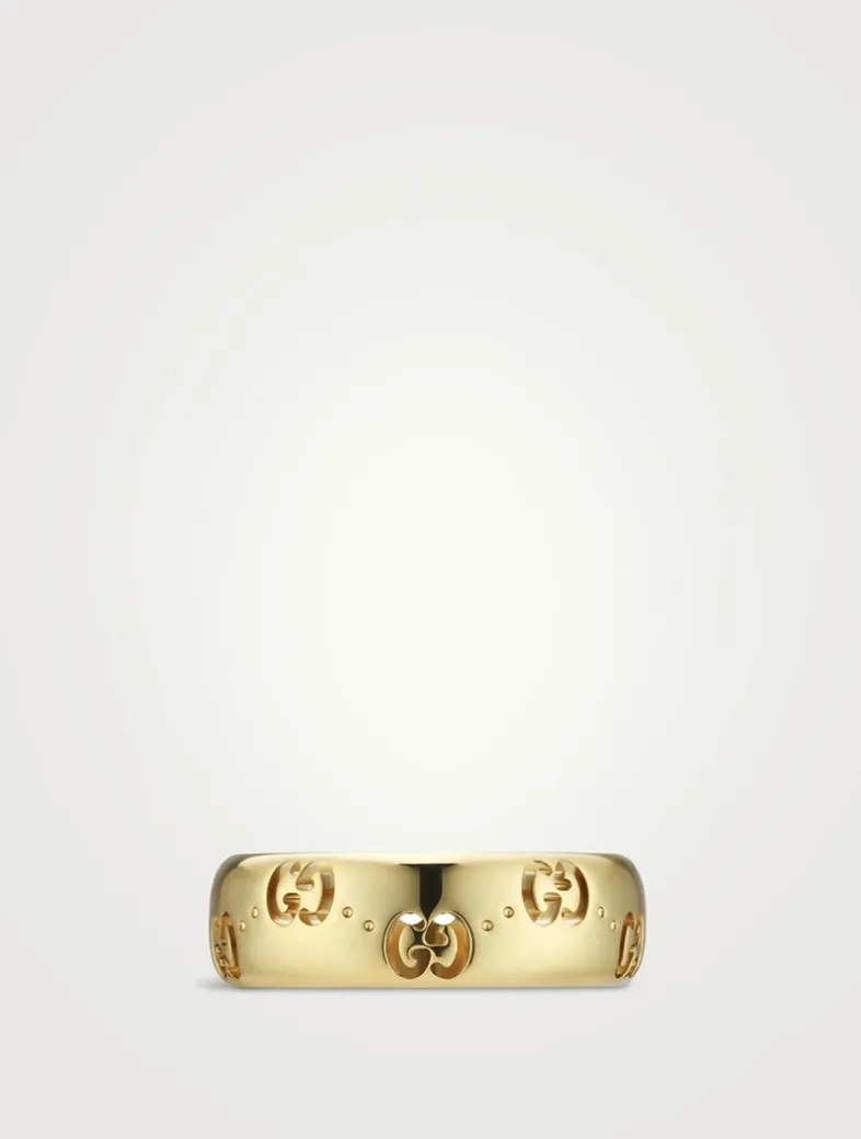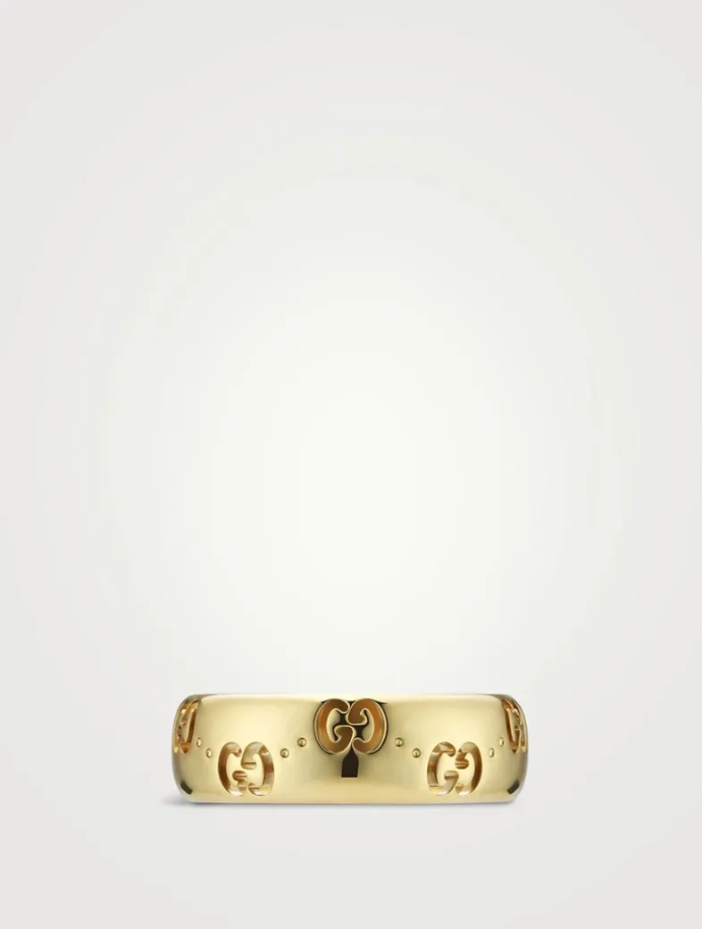 The Icon jewellery collection presents a new GG cut-out motif on rounded silhouettes. The signature House motif decorates this thin ring in 18k gold.