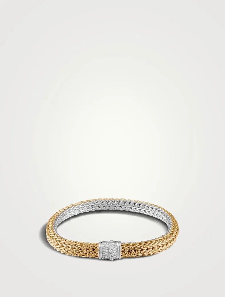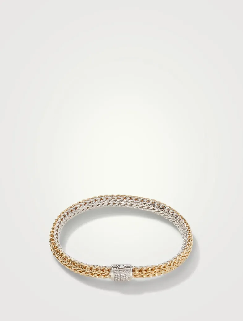Woven by hand, the heritage Icon Chain is the foundational expression of John Hardy artisanship. This edition is reversible, with reclaimed gold on one side, sterling silver on the other, and a pavé diamond clasp.