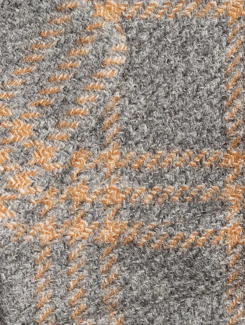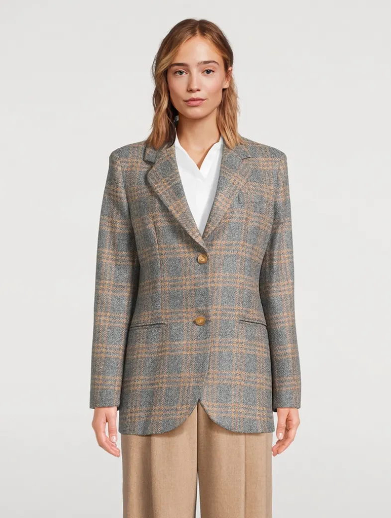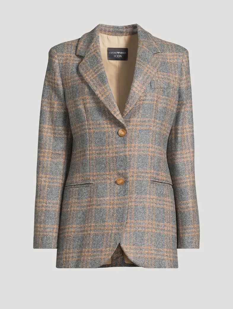 This single-breasted blazer is made of a virgin-wool blend embellished with an all-over check motif. The garment is part of the Icon capsule collection.