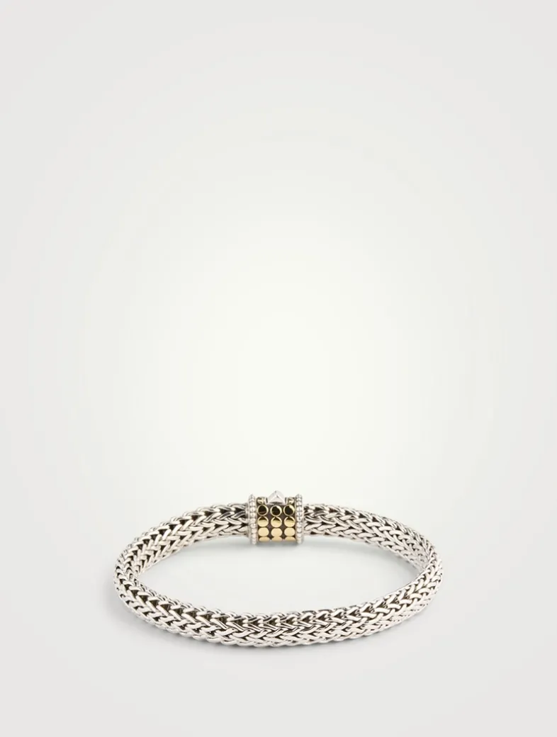 Cast, woven and finished entirely by hand, John Hardy’s heritage chain distills the complex art of weaving into a stunningly simple form, accented with a graphic gold dot clasp.